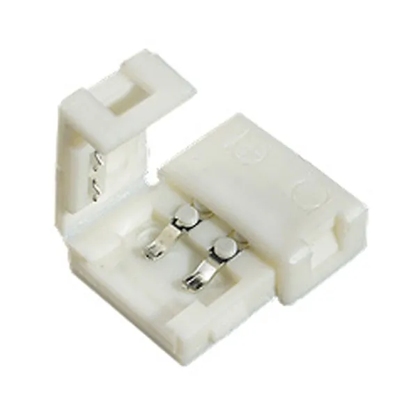 2-х сторонний разъем с фиксаторами для соединения 2-х отрезков светодиодных одноцветных лент шириной 8мм. Без провода. Материал - пластик. Максимальный допустимый ток 4А. Не рекомендуется соединять длинные отрезки лент!