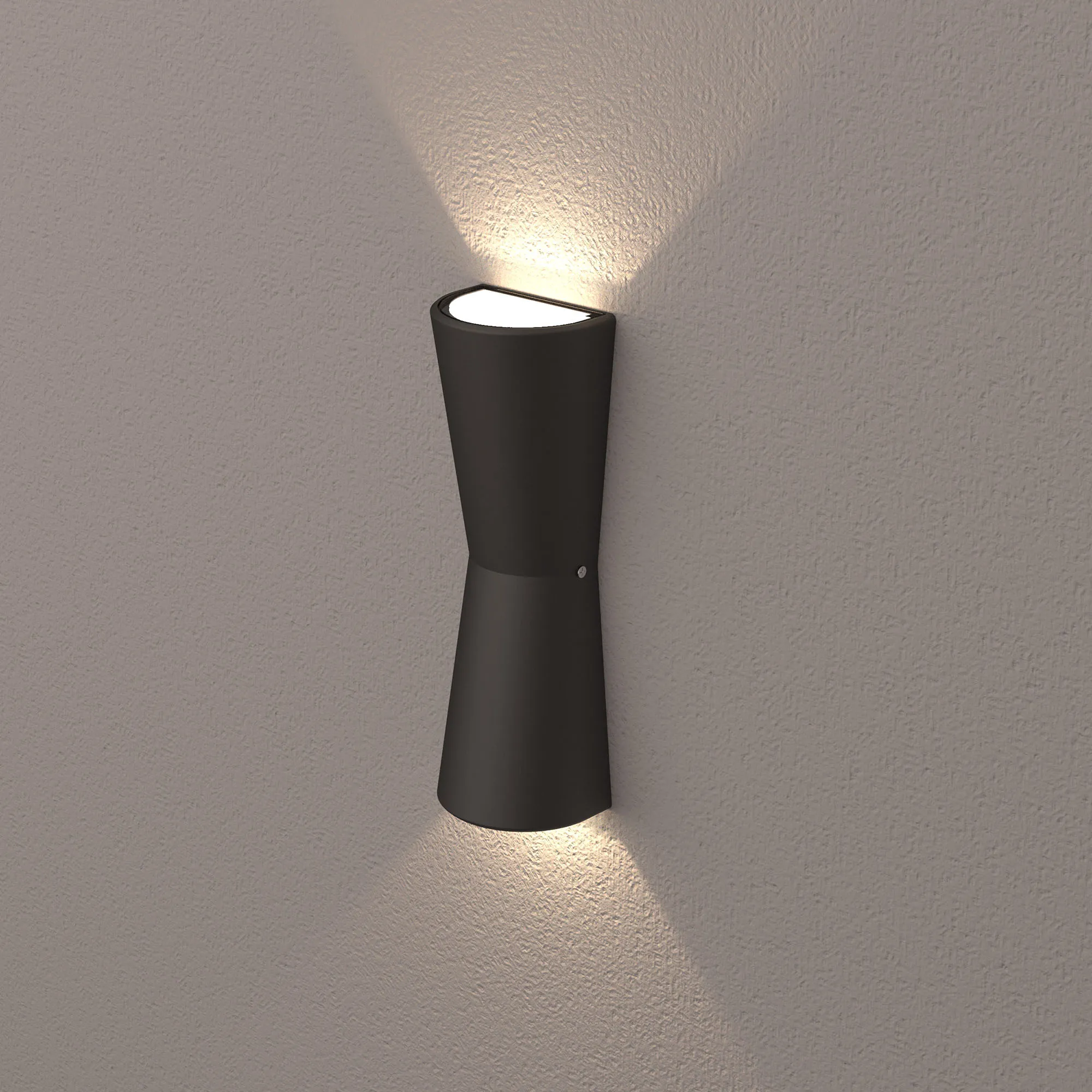 Светодиодный светильник для наружной подсветки стен, свет вверх-вниз. Цвет ТЕПЛЫЙ БЕЛЫЙ 3000К, 630Лм, светодиоды 2x5Вт Bridgelux, угол 97°. Влагозащищенный корпус IP54 - черный алюминий, экран закалённое стекло. Питание 220В, мощность 10 Вт. Размеры ДхШхВ -260х90х60 мм.