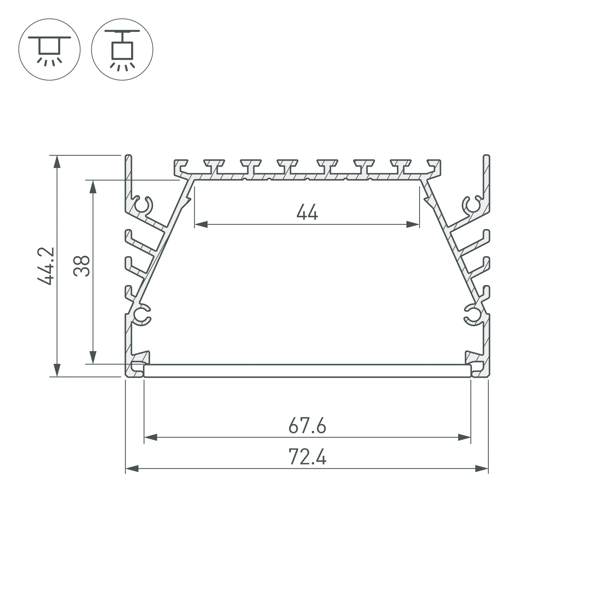 Алюминиевый анодированный широкий профиль для светодиодных лент и линеек. Габаритные размеры (L×W×H): 2000x72,4x44,2 мм. Ширина площадки для ленты 44 мм. Экраны, заглушки и другие аксессуары приобретаются отдельно. Цена за 1 метр.
