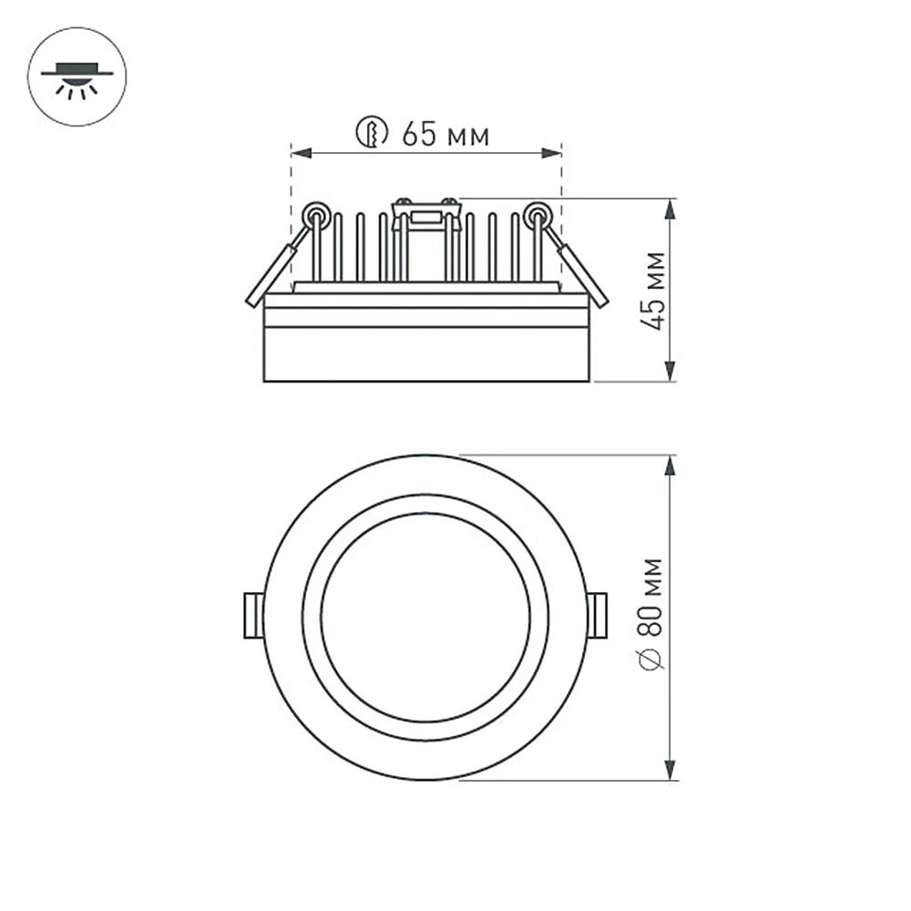 Встраиваемый светильник цилиндр, 5Вт, корпус белый алюминий + глянцевый акрил. Цвет ТЕПЛЫЙ БЕЛЫЙ 3000K, св.поток 400лм, CRI(Ra)>80, угол 120°. Размер Ф80x45мм, установка в отверстие Ф65мм. Питание 110-240VAC, 5Вт, 300mA 15-18V, драйвер в комплекте.