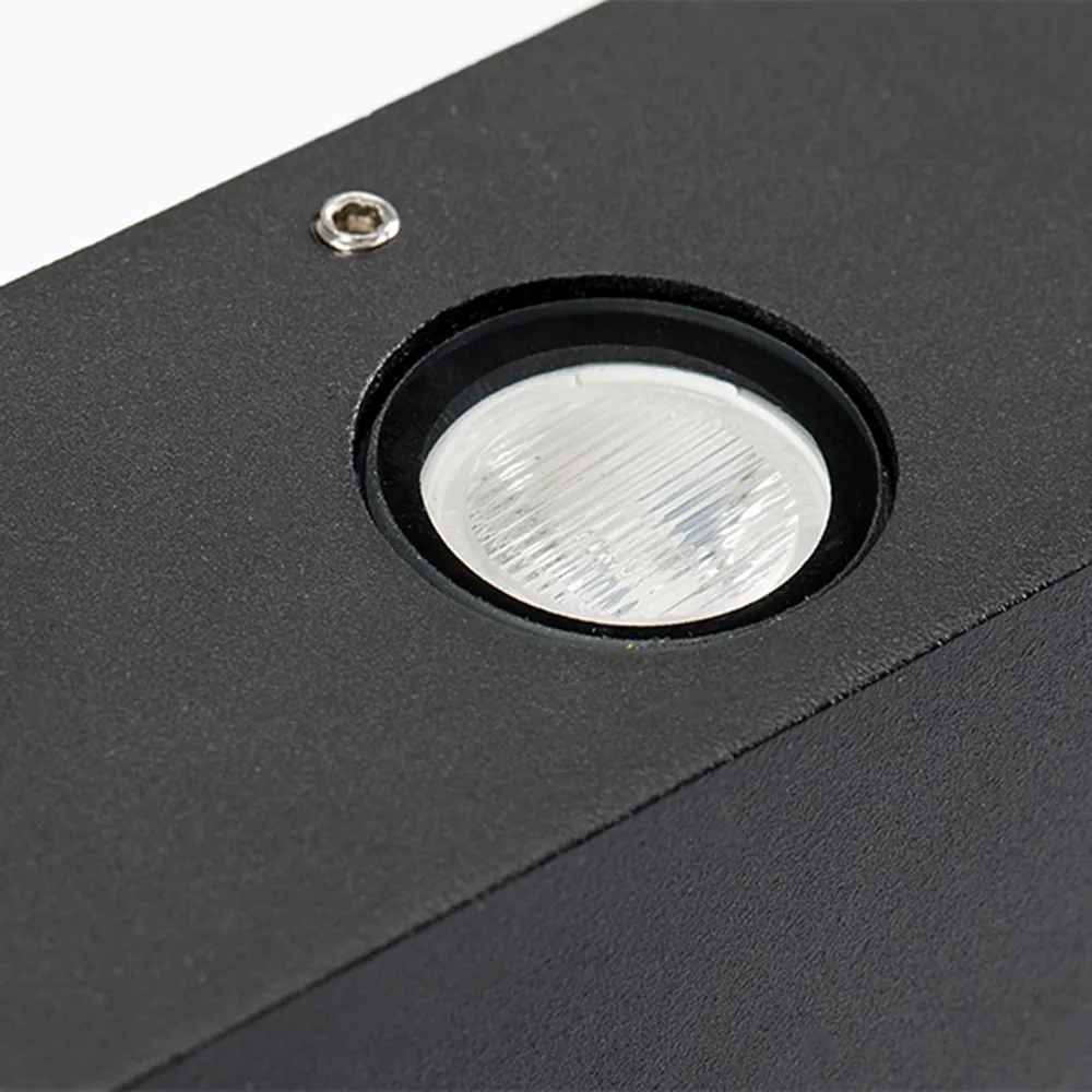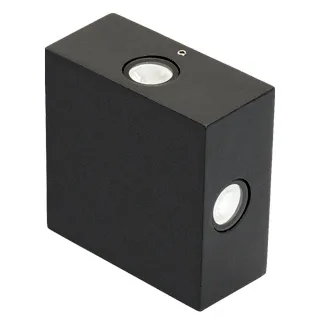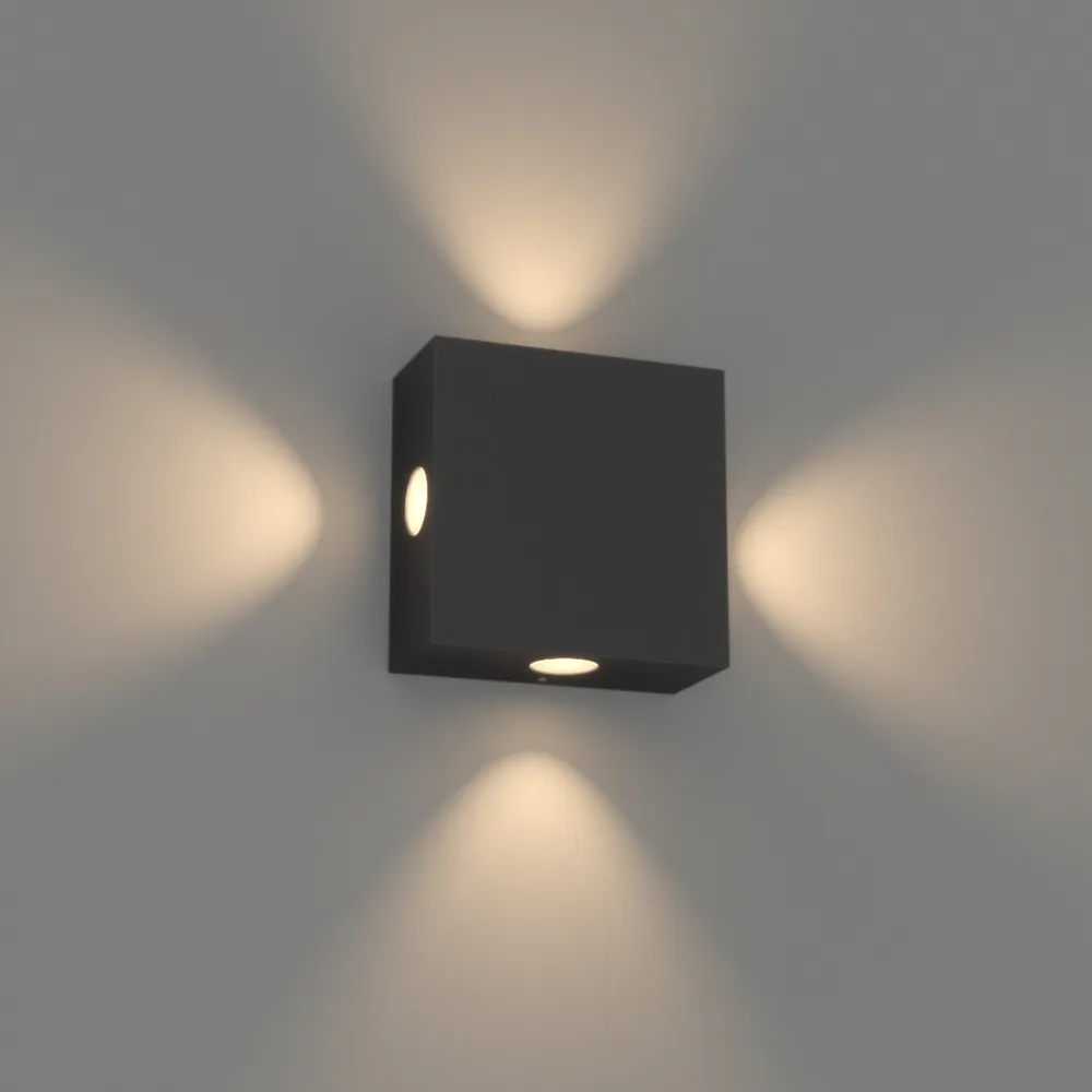 Уличный светодиодный светильник 4 узких луча, для стен, угол освещения 18°. Цвет ТЕПЛЫЙ БЕЛЫЙ 3000К, светодиоды 4x2Вт CREE (330 лм). Влагозащищенный корпус IP54 - черный алюминий, экран стекло. Питание 220В, мощность 8 Вт. Размеры ВхШхГ -110х110х50 мм.
