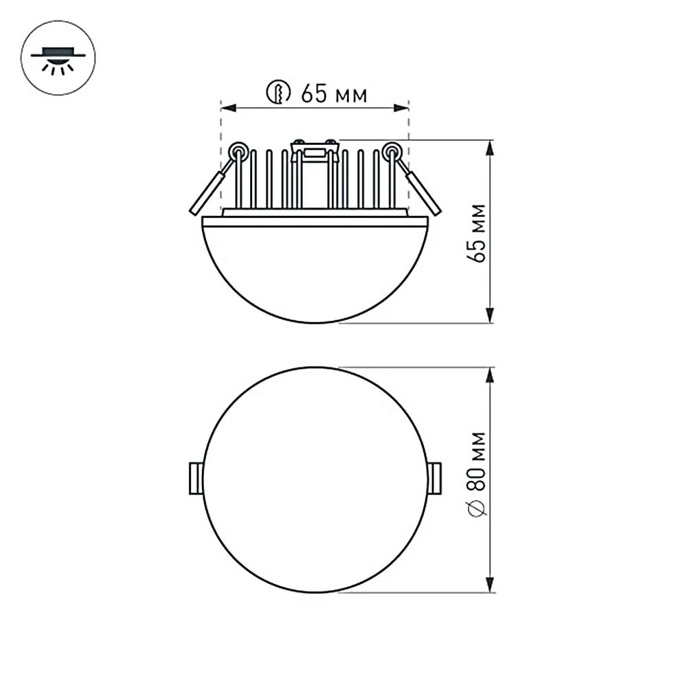 Встраиваемый светильник полусфера, 5Вт, корпус белый алюминий + матовый акрил. Цвет БЕЛЫЙ 6000K, св.поток 400лм, CRI(Ra)>80, угол 120°. Размер Ф80x65мм, установка в отверстие Ф65мм. Питание 110-240VAC, 5Вт, 300mA 15-18V, драйвер в комплекте.