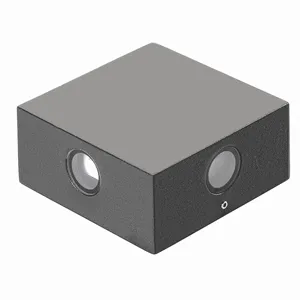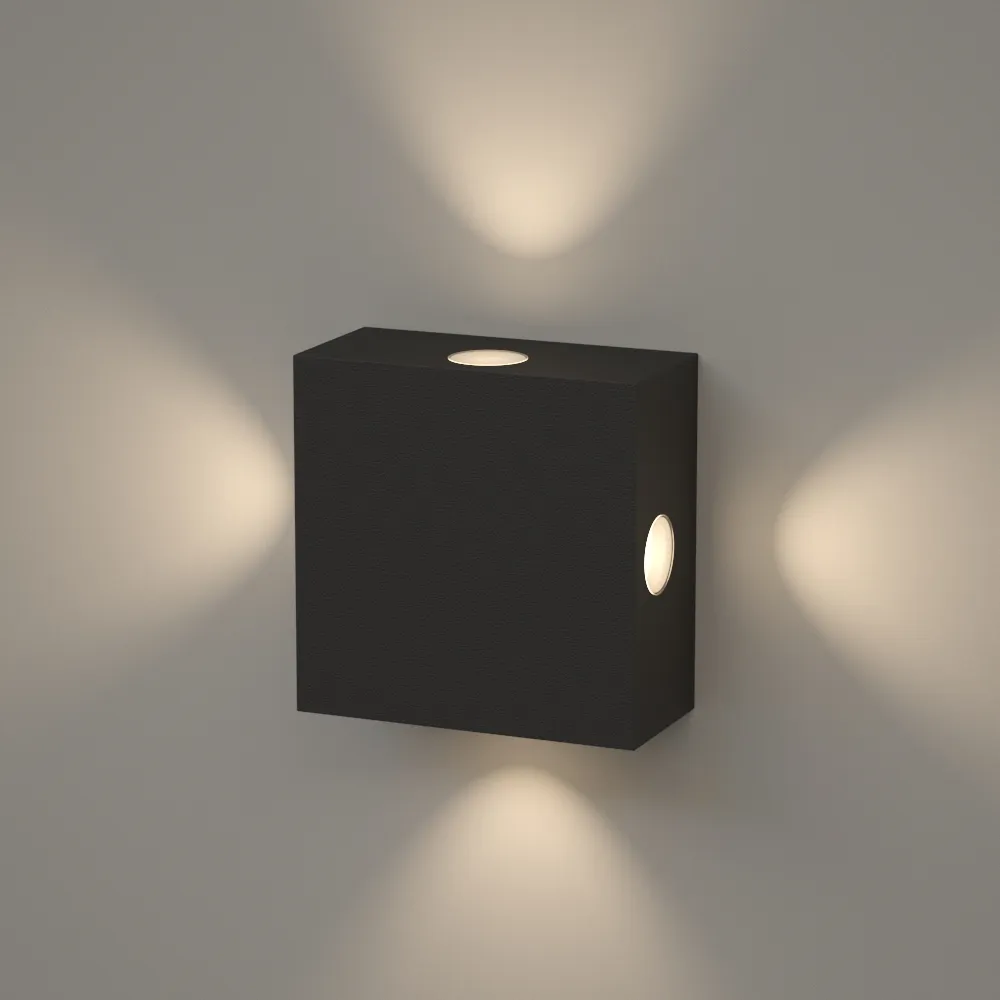 Уличный светодиодный светильник 4 широких луча, для стен, угол освещения 76°. Цвет ТЕПЛЫЙ БЕЛЫЙ 3000К, светодиоды 4x2Вт CREE (170 лм). Влагозащищенный корпус IP54 - темно-серый алюминий, экран стекло. Питание 220В, мощность 8 Вт. Размеры ВхШхГ -110х110х50 мм.