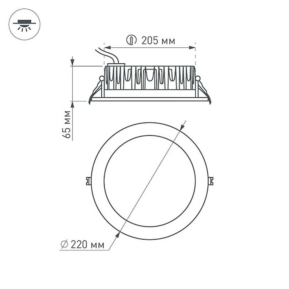 Встраиваемый круглый светильник, угол 110° / 30Вт / ТЕПЛЫЙ БЕЛЫЙ 3000K / светодиод 1x30W / 2700 лм, CRI>80. Белая лицевая панель. IP44. Питание AC180-240V, 30Вт, 700mA 39-47V, драйвер в комплекте. Размеры DxH: 220х65мм, отверстие для установки 205мм.
