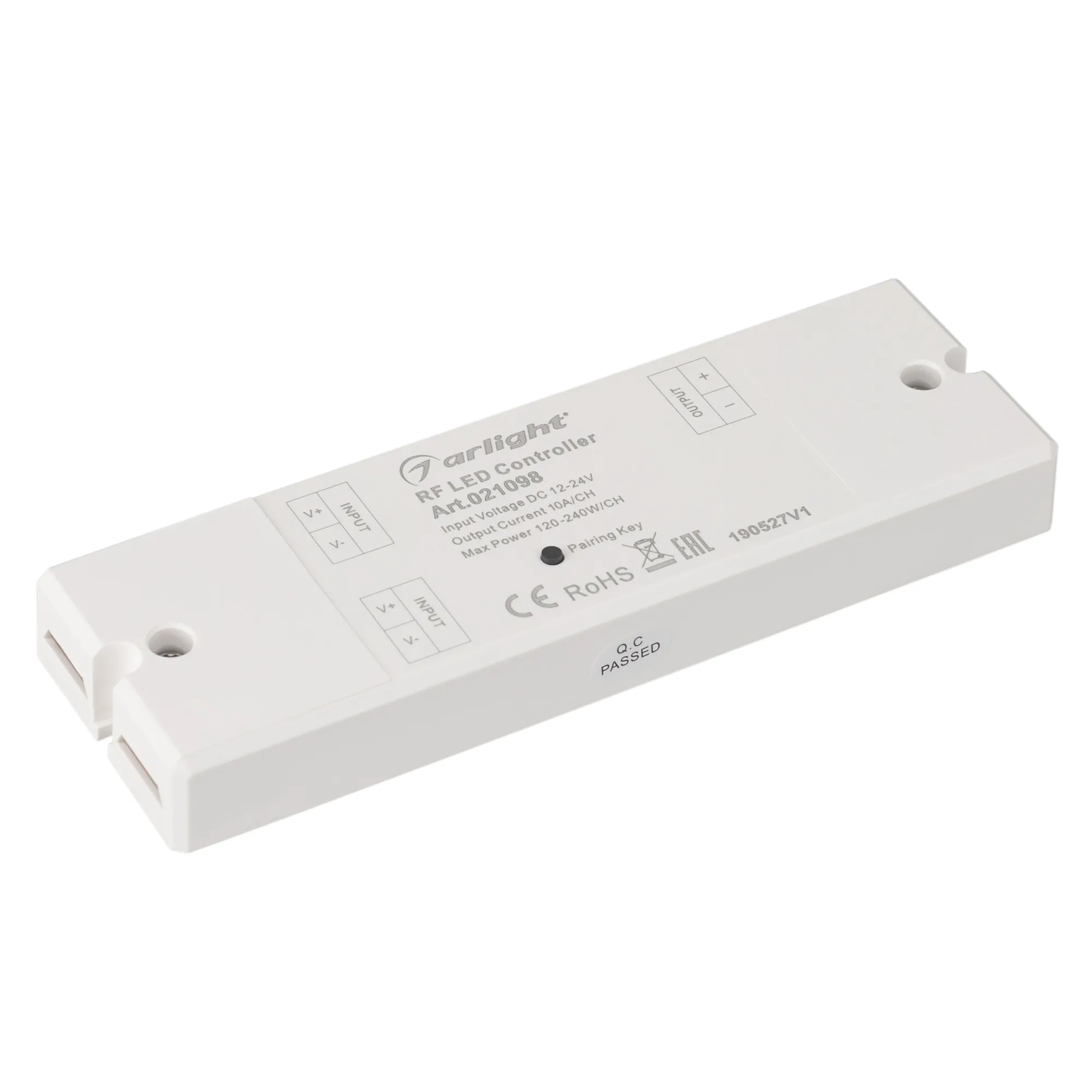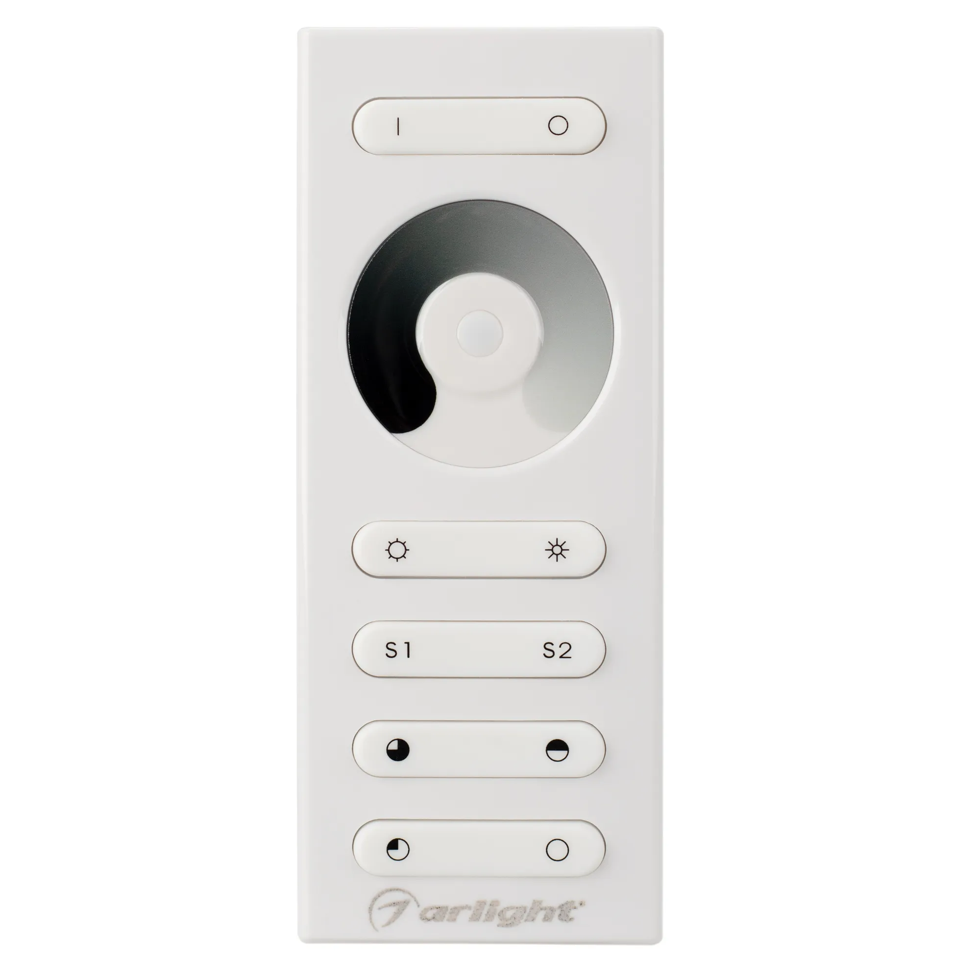 Однозонный диммер, комплект из пульта RF (868MHz) с сенсорным кольцом и контроллера 12-24 В, 1х10А, 120-240 Вт. Белый корпуc. Размеры пульта 120x48x17 мм, контроллера 145х46х16 мм.
