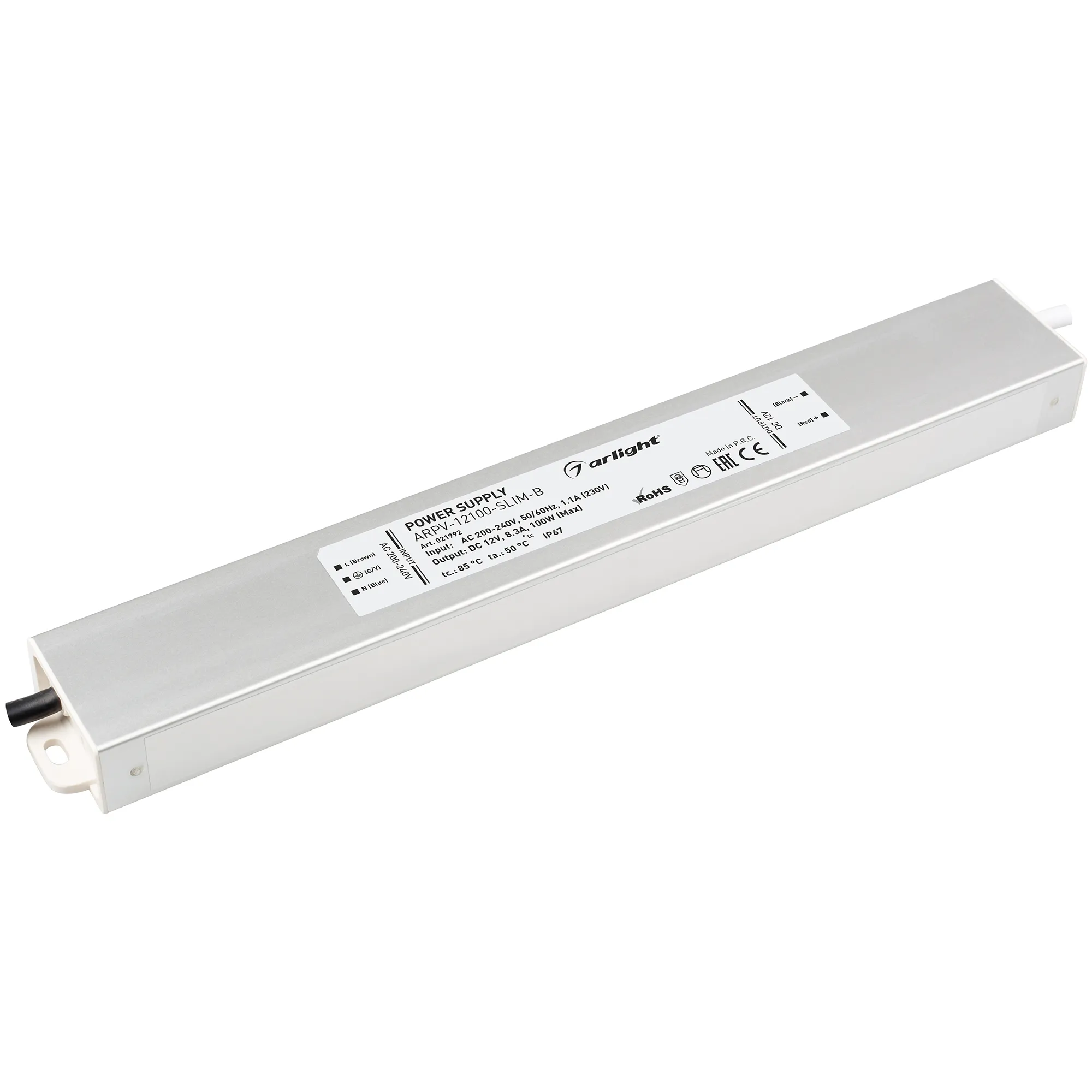 Источник напряжения с гальванической развязкой для светодиодных изделий. Входное напряжение 200-240 VAC. Выходные параметры: 12 В, 8,3 А, 100 Вт. Встроенный PFC >0,5. Герметичный алюминиевый корпус IP 67. Рабочая температура -30…+50C⁰. Габаритные размеры длина 298 мм, ширина 40 мм, высота 23.5 мм. Гарантийный срок 3 года.
