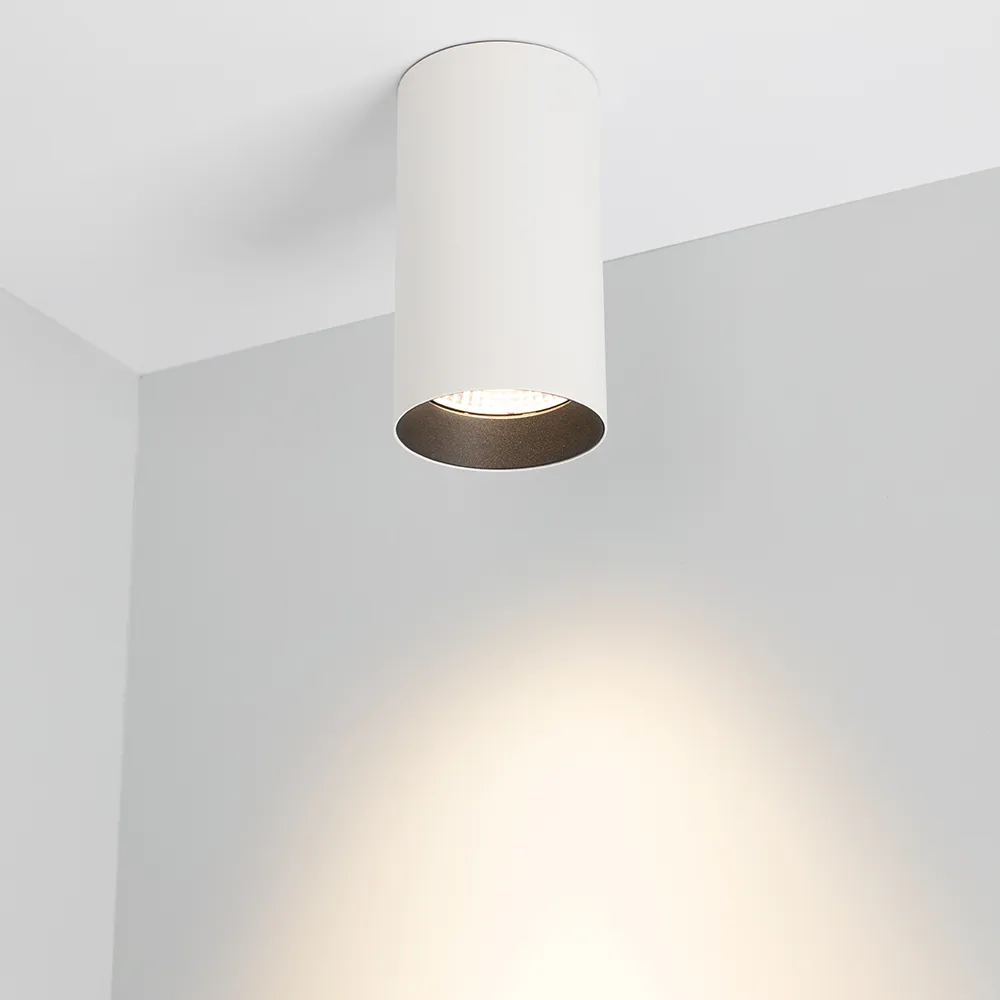 Накладной светильник 15Вт, белый круглый корпус, черная вставка, металл. Цвет ТЕПЛЫЙ БЕЛЫЙ 3000K, св.поток 1100лм, CRI(Ra)>80, угол 40°. Размер Ø85x155мм. Встроенный драйвер PRI:220-240VAC, SEC:DC 500mA 23-36V 15Вт.