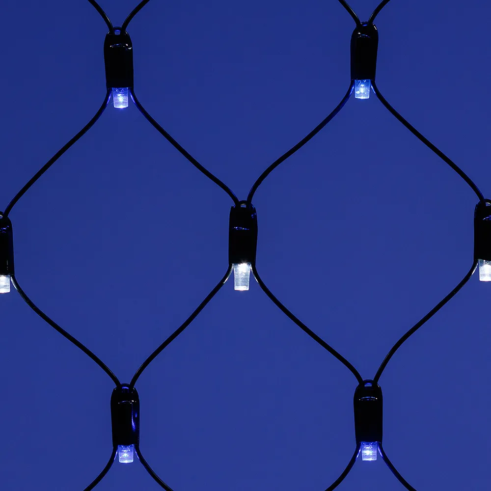 Светодиодная сеть Classic. 2000x1500 (длина 2000 мм, высота 1500 мм). Цвет свечения СИНИЙ. 288 светодиодов размером 7 мм со статическим и 8 динамическими эффектами свечения с резким световым рисунком (прозрачная вогнутая линза). Провод черный, ПВХ. Питание 230 В, Мощность 18 Вт,защита IP65, применение в помещении и на улице под навесом Аксессуары для подключения и выбора режима свечения в комплекте.