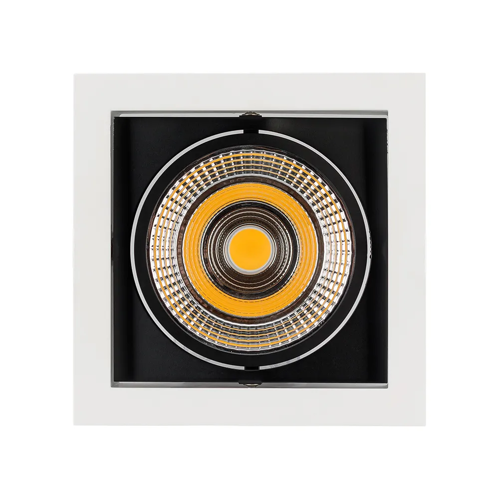 Поставка под заказ от 100 штук. Встраиваемый карданный светильник. Угол 30° / 25Вт / ТЕПЛЫЙ БЕЛЫЙ 3000K / 2200лм, CRI>90. Корпус из белого алюминия с черными вставками. Питание AC220-240V, 25Вт, 700mA 30-42V, драйвер в комплекте. Размеры LxWxH: 152х152x95мм, отверстие для установки 140x140мм.