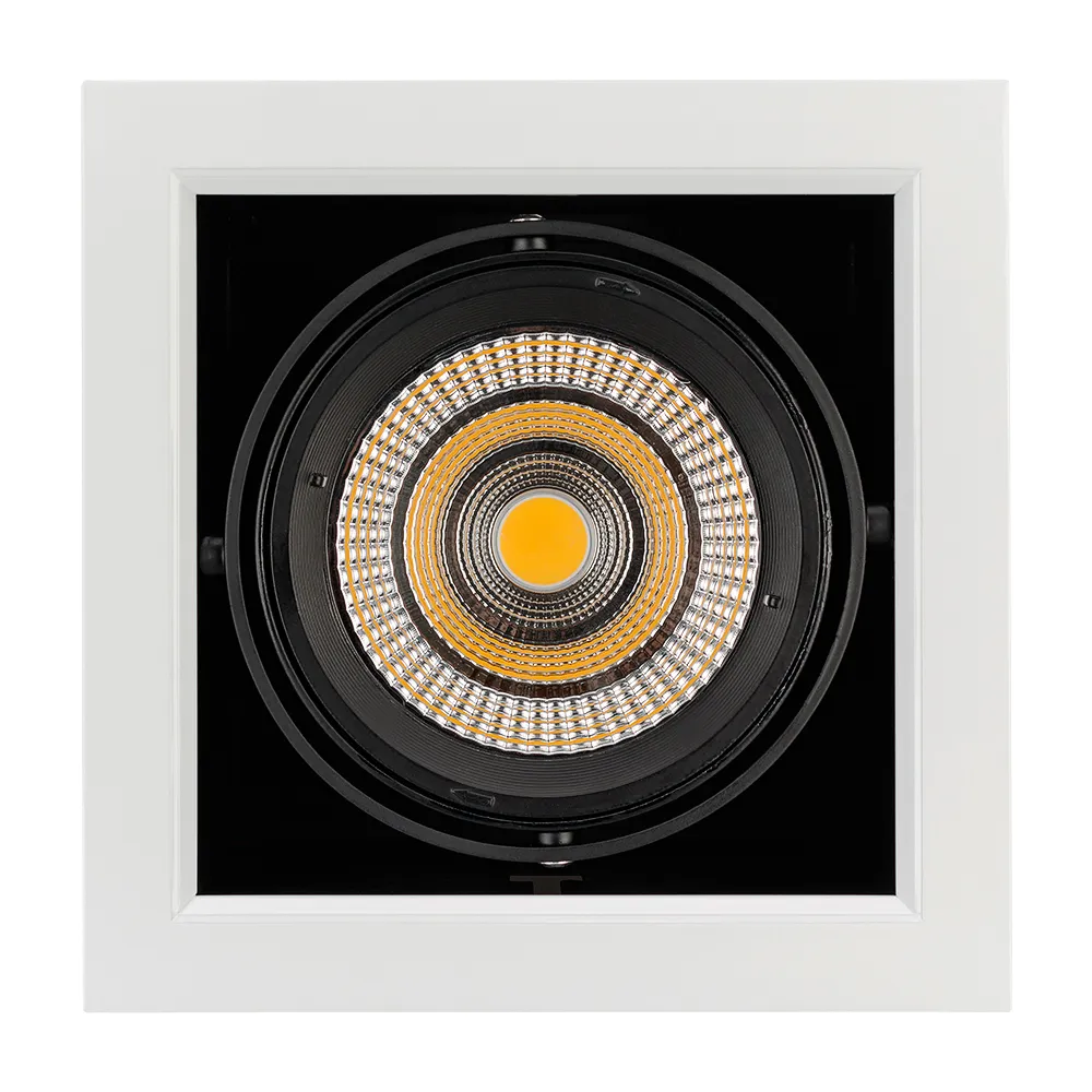 Встраиваемый карданный светильник. Угол 30° / 25Вт / ТЕПЛЫЙ БЕЛЫЙ 3000K / 2200лм, CRI>90. Корпус из белого алюминия с черными вставками. Питание AC220-240V, 30Вт, 700mA 30-42V, драйвер встроенный. Размеры LxWxH: 190х190x145мм, отверстие для установки 165x165мм.