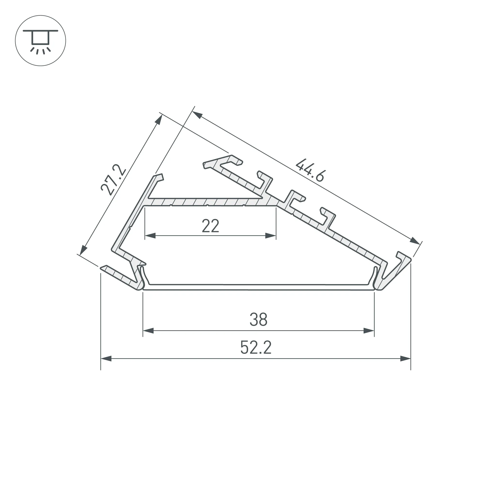 Алюминиевый анодированный угловой профиль для светодиодных лент и линеек. Угол свечения 30°. Габаритные размеры (L×W×H): 2000x44,6x27,2 мм. Ширина площадки для ленты 22 мм. Экраны (плоские, круглые или квадратные), заглушки и другие аксессуары приобретаются отдельно. Цена за 1 метр.