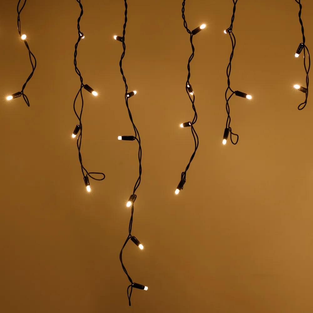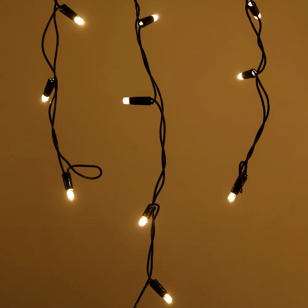 Светодиодная бахрома Classic. Размер 2400x600 мм (длина 2400 мм, по длине 24 нити высотой 200/600 мм). Количество светодиодов 88 шт размером 7 мм. Цвет свечения ТЕПЛЫЙ БЕЛЫЙ (3000 К), эффект постоянного свечения с резким световым рисунком (прозрачная вогнутая линза). Провод черный, ПВХ. Питание 230 В, Мощность 6 Вт, защита IP65, применение на улице под навесом. Аксессуары для подключения приобретаются отдельно.
