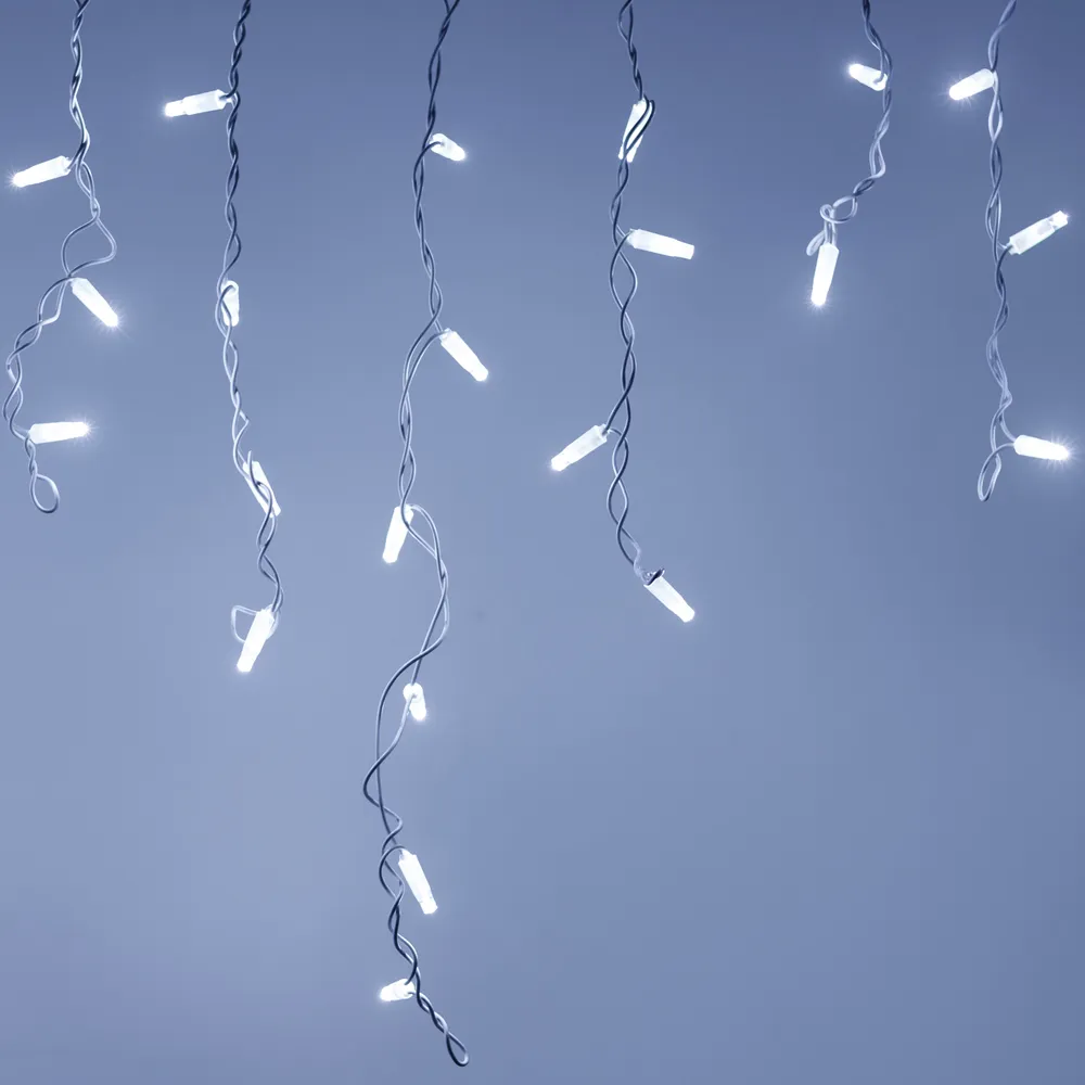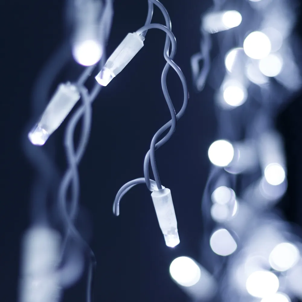 Светодиодная бахрома Classic. Размер 2400x600 мм (длина 2400 мм, по длине 24 нити высотой 200/600 мм). Количество светодиодов 88 шт размером 7 мм. Цвет свечения БЕЛЫЙ (6000 К), эффект постоянного свечения резким световым рисунком (прозрачная вогнутая линза). Провод белый, ПВХ. Питание 230 В, Мощность 6 Вт, защита IP65, применение на улице под навесом. Аксессуары для подключения приобретаются отдельно.