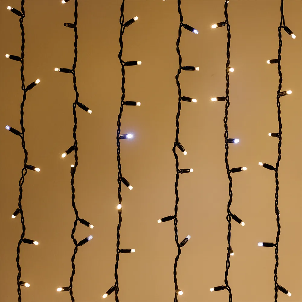Светодиодный Занавес Pro. Размер 2000x3000 мм (длина 2000 мм, высота 3000 мм). 20 ниспадающих нитей длиной 3000 мм. 760 светодиодов размером 7 мм. Основной цвет свечения ТЕПЛЫЙ БЕЛЫЙ (3000 К), эффект мерцания редких точек БЕЛЫЙ (6000К) с резким световым рисунком (прозрачная вогнутая линза), соотношение светодиодов: 634 теплых постоянного свечения / 126 белых с мерцанием. Эффект частого мерцания. Провод черный, каучук. Питание 230 В, Мощность 70 Вт, защита IP65, применение в помещении и на улице под навесом. Аксессуар для подключения и выбора режима свечения в комплекте.
