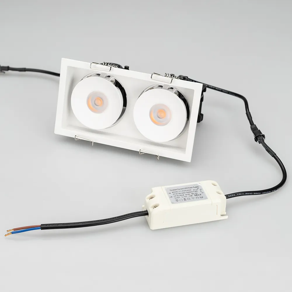 Встраиваемый поворотный светильник для потолка. Мощность 2x9W, цвет ТЕПЛЫЙ 3000K, св.поток 1260лм, угол 45°, RA>90. Корпус прямоугольный белый. Питание AC180-240V. Размеры LxWxH 148x80x90мм. Установка в отверстие 140x70мм. Драйвер в комплекте 2 шт (30-45V, 220mA).