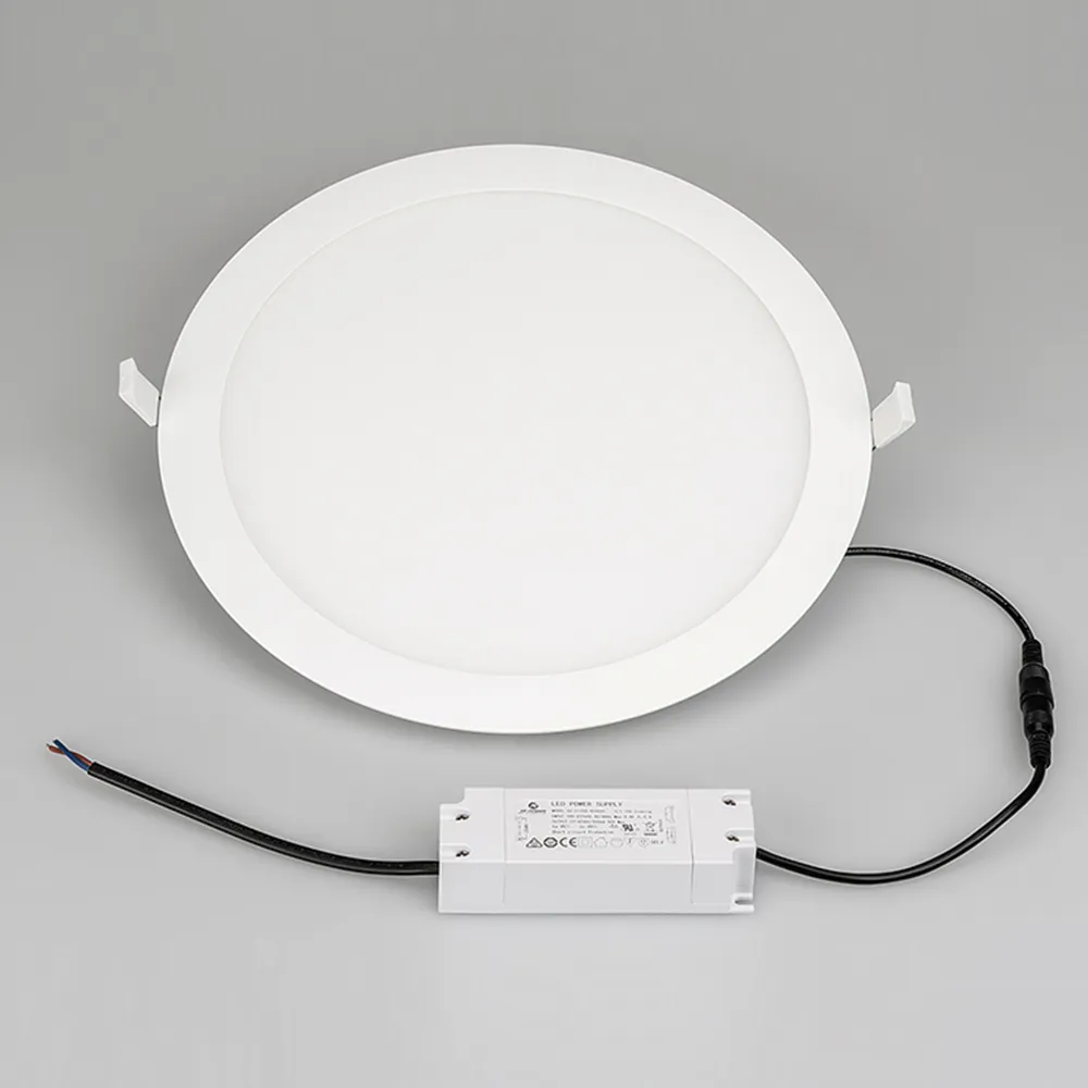 Тонкая круглая панель, белая, 25Вт / БЕЛЫЙ 6000K / 1987лм / 120°. CRI>80. Размер Ф300 x 13мм (в отверстие 280мм). Корпус круглый плоский, белый. Питание от сети 220VAC, драйвер в комплекте (не диммируется, 30-40V, 600mA).