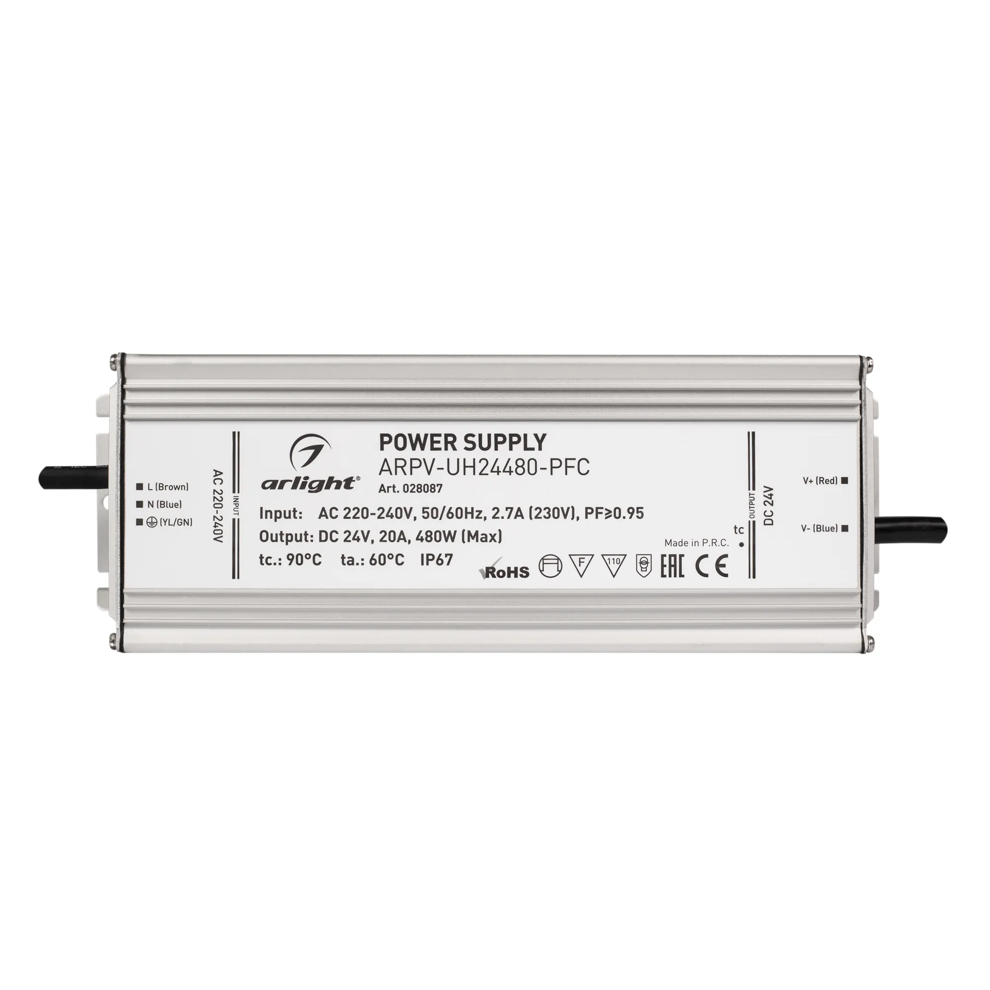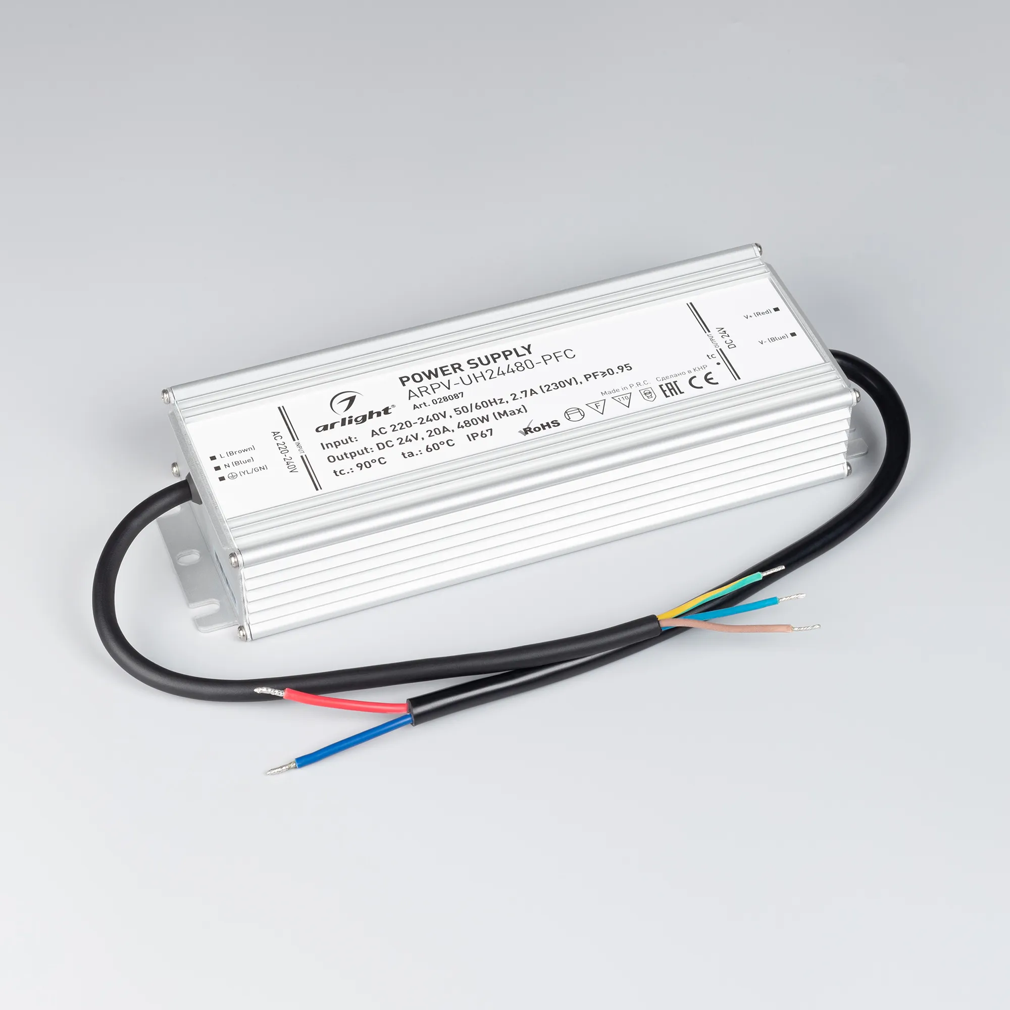 Источник напряжения с гальванической развязкой для светодиодных изделий. Входное напряжение 220-240 VAC. Выходные параметры: 24 В, 20 А, 480 Вт. Встроенный PFC >0,95. Герметичный алюминиевый корпус IP 67. Рабочая температура -40…+60C⁰. Габаритные размеры длина 251 мм, ширина 90 мм, высота 41.5 мм. Гарантийный срок 7 лет.