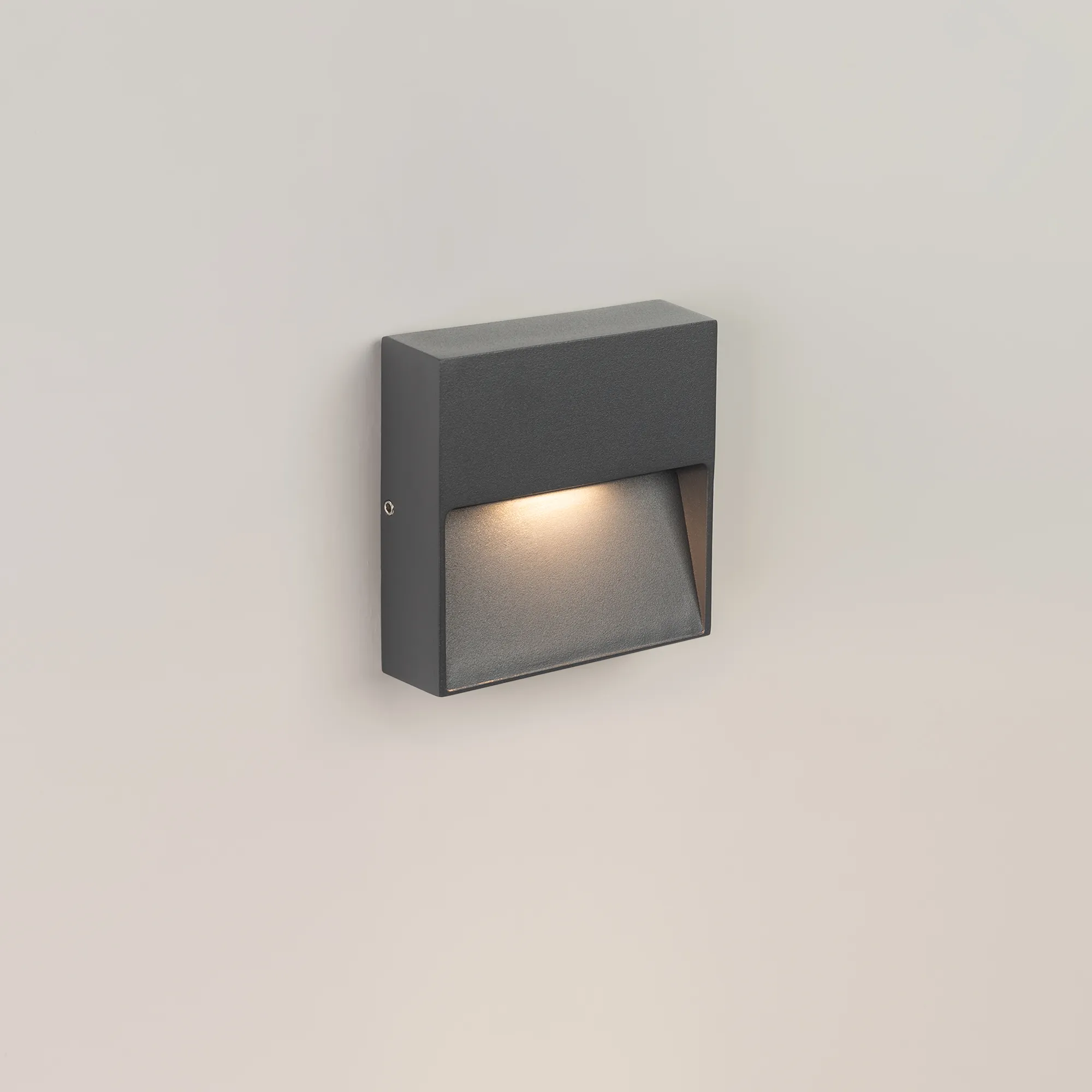 Светодиодный накладной квадратный светильник для стен, лестниц, 4Вт. Цвет ТЕПЛЫЙ БЕЛЫЙ 3000K, св.поток 160лм, CRI(Ra)>80, угол 65°, асимметричный свет. Размер 100x100x30мм. Влагозащищенный корпус IP65, алюминий серого цвета. Питание AC230V, 4Вт, встроенный драйвер.