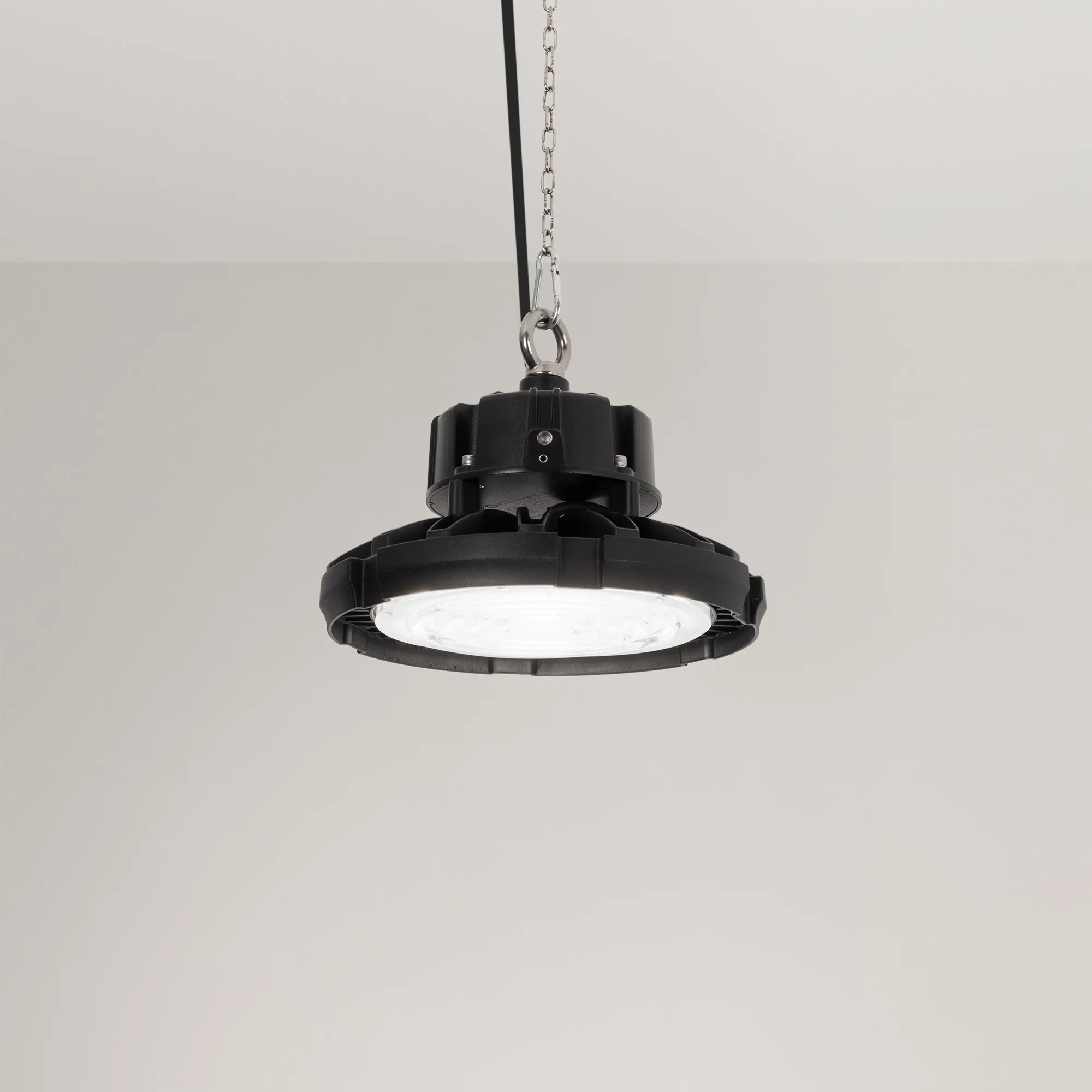 Поставка под заказ от 200 шт. Светильник для освещения складских и промышленных помещений. Мощность 100W, напряжение питания AC 220-240V/50Hz. CRI 80. Тип светодиодов SMD2835, с групповой оптической линзой. Цвет свечения ДНЕВНОЙ 5000K, световой поток 14000 Lm, угол рассеивания 60°. Цвет корпуса черный, линза из поликарбоната, степень влагозащиты IP65. Габариты Ф245xH188мм. Рым-болт в комплекте.