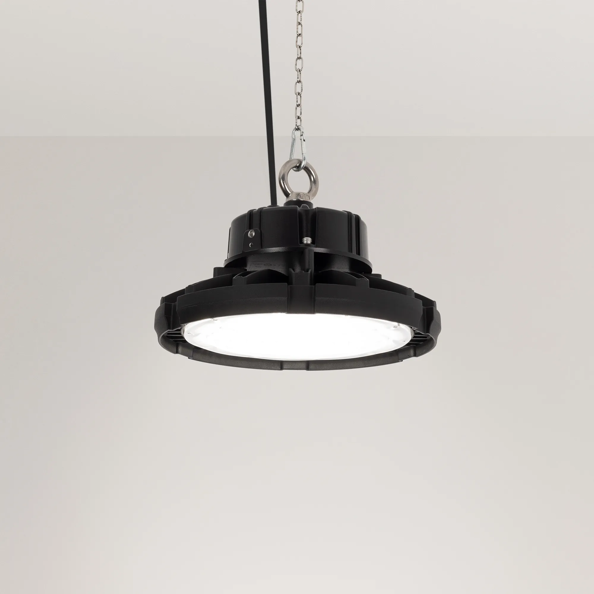 Поставка под заказ от 200 шт. Светильник для освещения складских и промышленных помещений. Мощность 150W, напряжение питания AC 220-240V/50Hz. CRI 80. Тип светодиодов SMD2835, с групповой оптической линзой. Цвет свечения ДНЕВНОЙ 5000K, световой поток 21000 Lm, угол рассеивания 90°. Цвет корпуса черный, линза из поликарбоната, степень влагозащиты IP65. Габариты Ф285xH193мм.