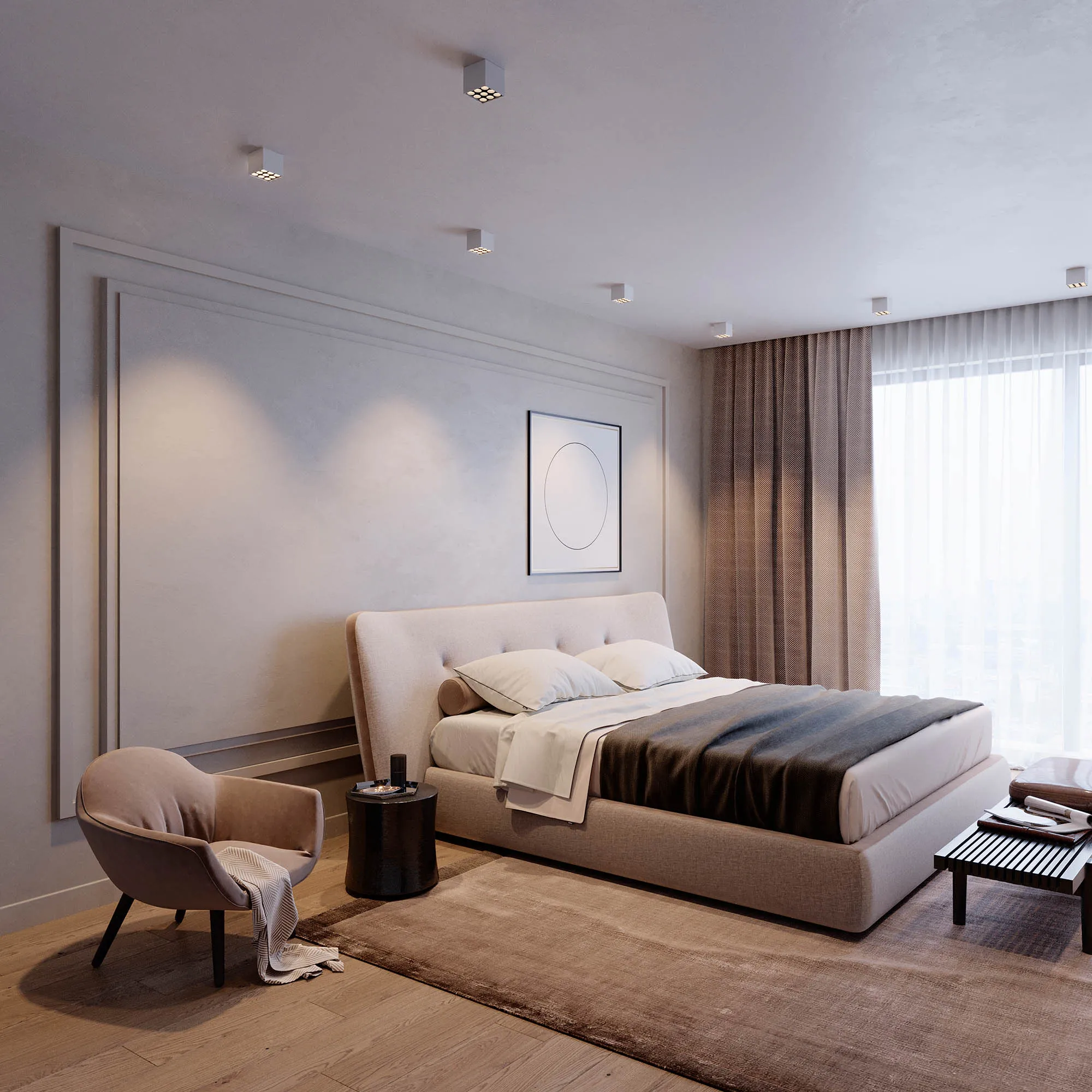 Накладной интерьерный светильник. Мощность 20 Вт, св. поток 1431 лм, 68 лм/Вт, дневной 4000 K, CRI>98, угол 30°, напряжение питания 230 В. Белый квадратный корпус из алюминия, степень защиты IP20. Размер: длина 95 мм, ширина 95 мм, высота 85 мм. Монтаж накладной. Драйвер 21-40 В, 600 мА, пульсация <5%.