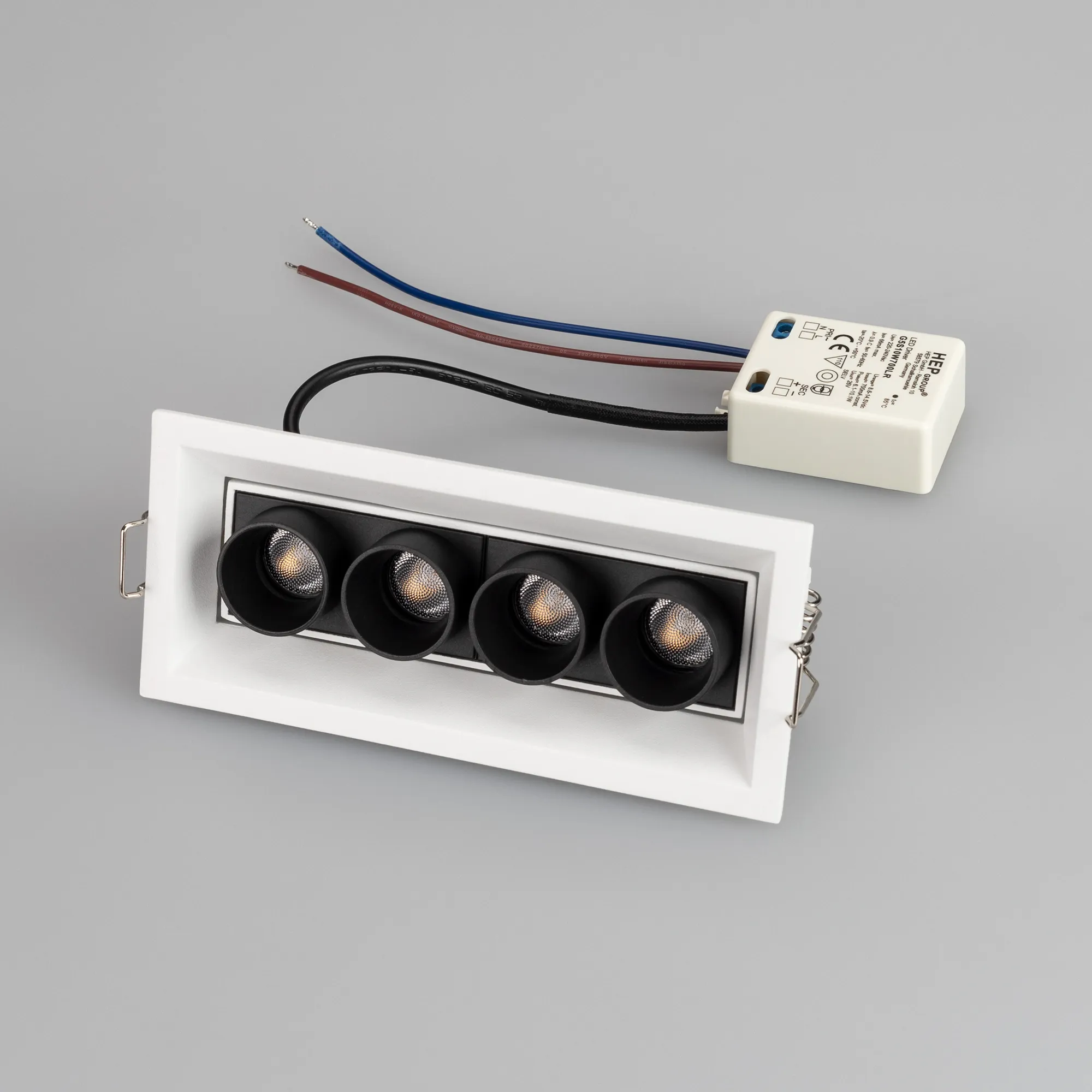 Встраиваемый поворотный светильник. Мощность 10 Вт, св. поток 750 лм, 75 лм/Вт, дневной 4000 K, CRI>98, угол 30°, напряжение питания 230 В. Белый прямоугольный корпус из алюминия, экран PMMA, степень защиты IP20. Размер: длина 150 мм, ширина 67 мм, высота 50 мм. Монтаж встраиваемый, установочное отверстие длина 145 мм, ширина 60 мм. Драйвер 9-14 В, 700 мА, пульсация <1%.