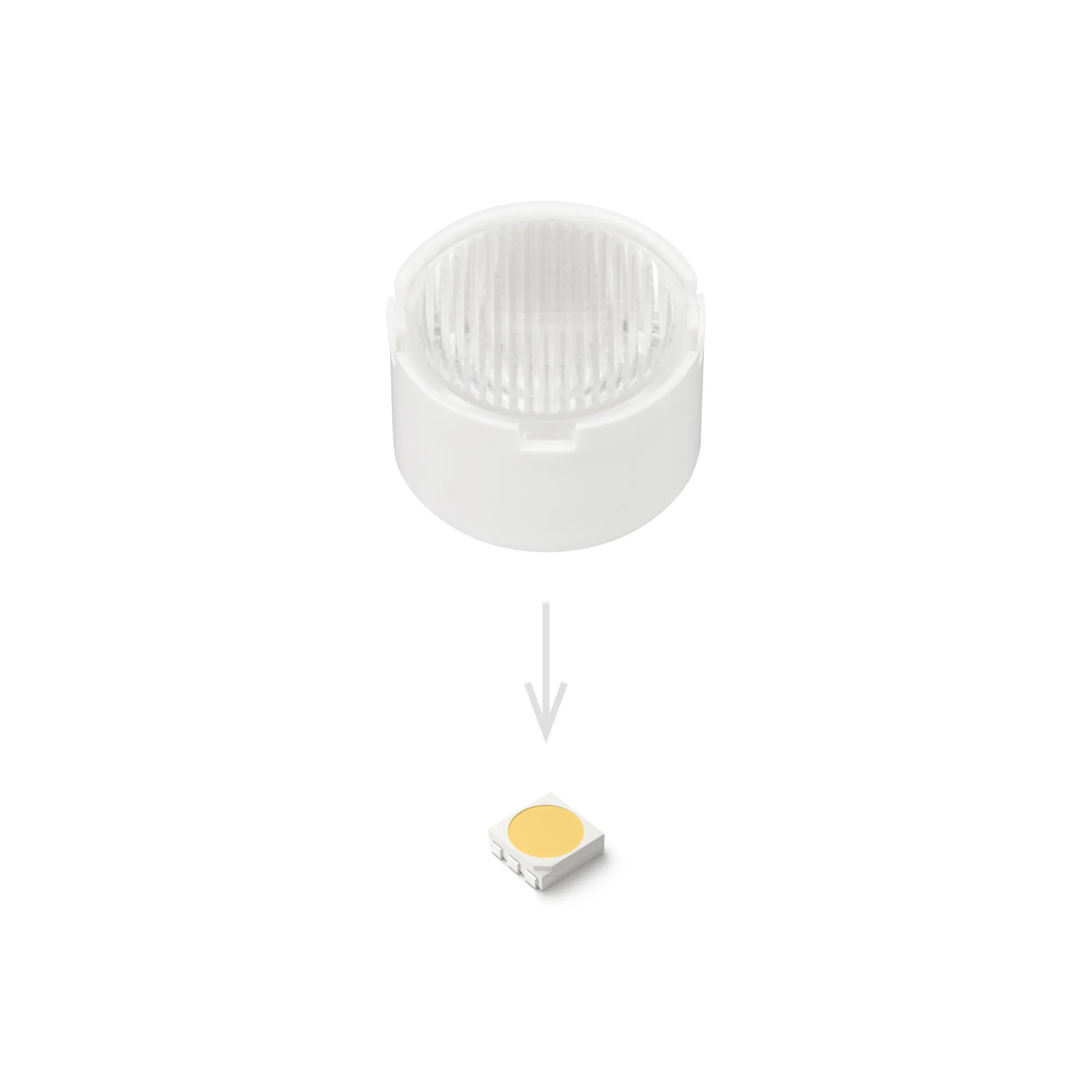 Поставка под заказ от 1800 шт. Одиночная линза со съемным холдером белого цвета для светодиодов SMD: 2525, 2835, 3030, 3535, 5050. Угол обзора: вертикальный 15°, горизонтальный 55°, прозрачная микропризма. Материал PMMA. Диаметр 19.5 мм, высота 11.76 мм.
