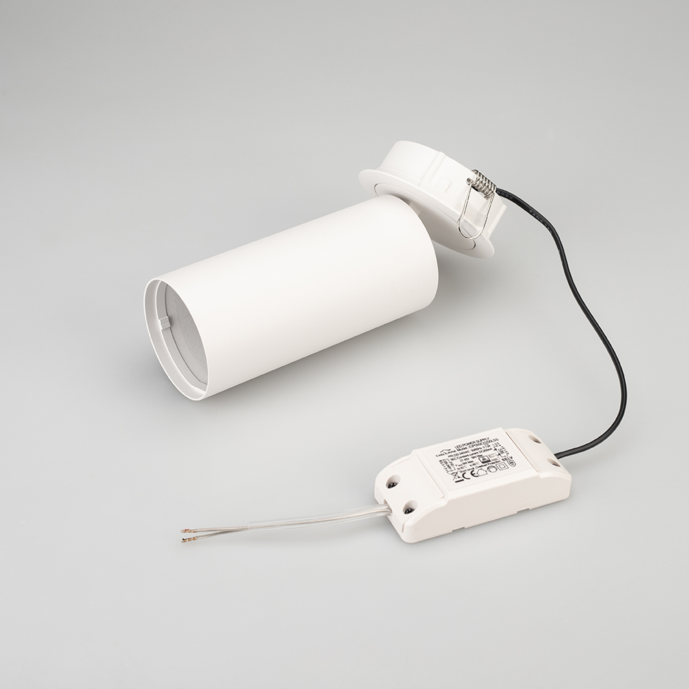 Корпус встраиваемый откидной для светильника POLO-R65 (1 часть из 3). Материал корпуса белый алюминий. Размер DxH Ø65x174мм, встроенный драйвер PRI:220-240VAC, SEC:DC 200mA 30-43V, 8Вт. Установка в отверстие Ø75мм.