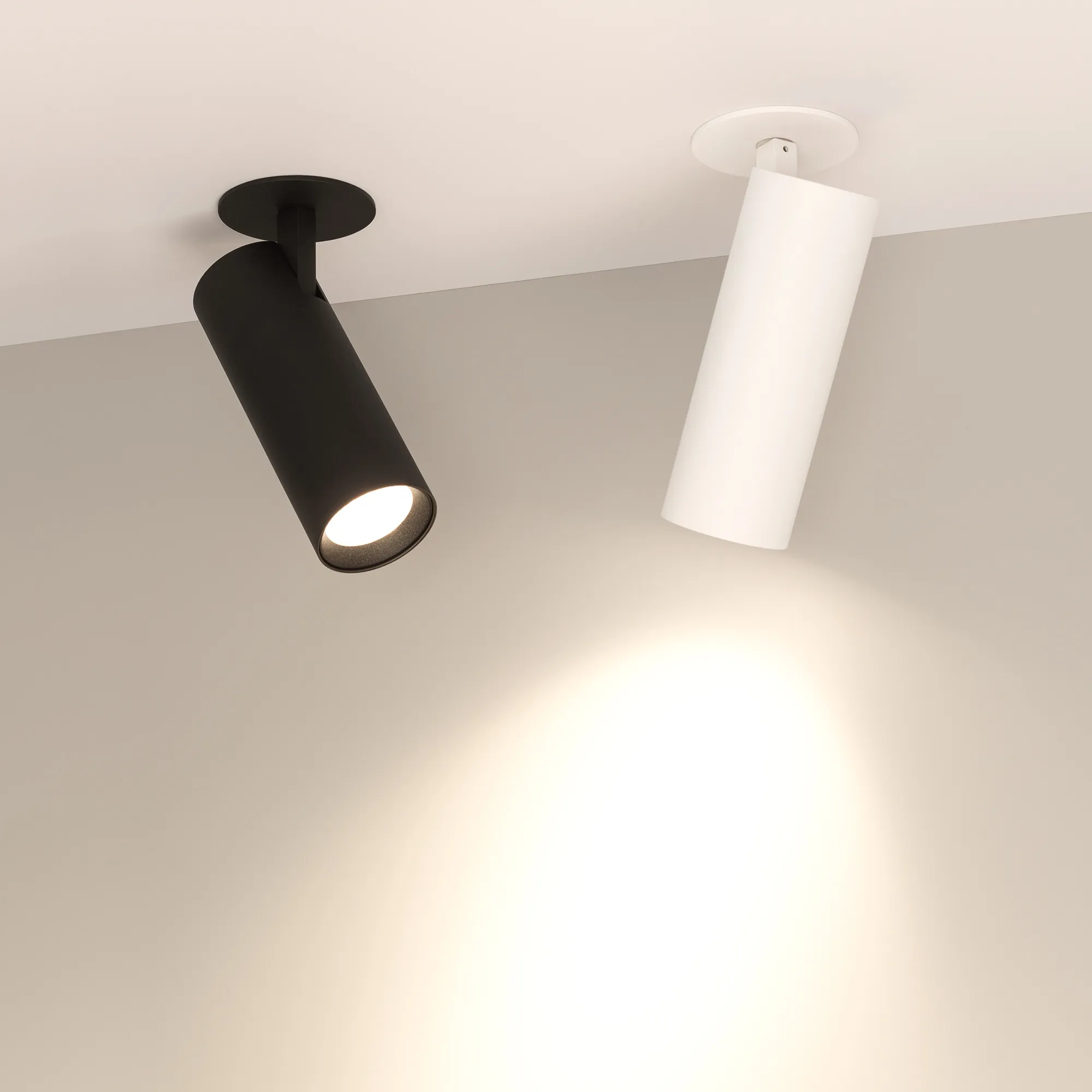 Встраиваемый поворотный светильник для потолка. Мощность 16 Вт, св. поток 1280 лм, 80 лм/Вт, теплый 3000 K, CRI>90, угол 25°, напряжение питания 230 В. Белый корпус из алюминия, линза PC, степень защиты IP20. Размер: диаметр 55 мм, длина 150 мм, высота 80 мм. Угол поворота 350°, угол наклона 90°. Монтаж встраиваемый, установочное отверстие диаметр 60 мм, глубина 30 мм. Драйвер 26-40 В, 400 мА, пульсация <5%.