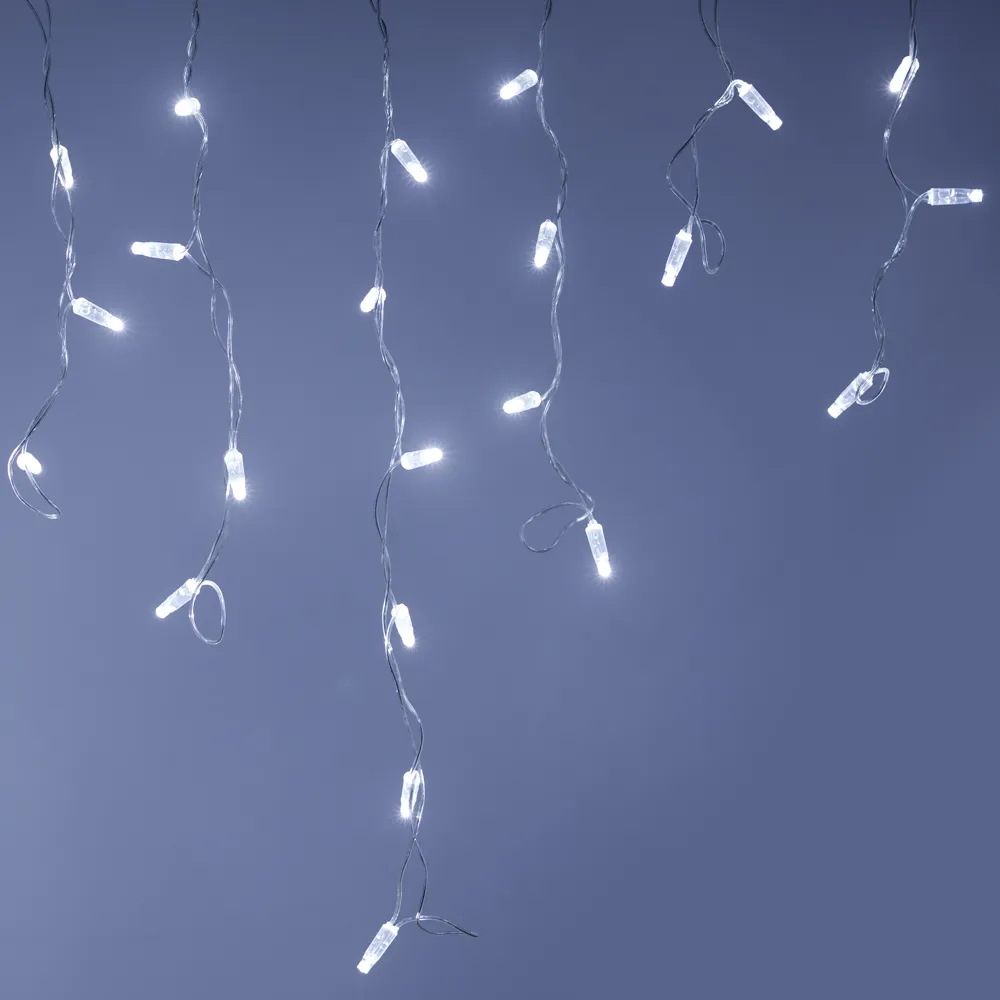 Светодиодная бахрома Classic. Размер 2400 мм (длина 2400 мм, по длине 24 нити высотой 200/600 мм). Количество светодиодов 88 шт размером 7 мм. Цвет свечения БЕЛЫЙ (6000 К). Эффект медленного мерцания каждого светодиода с резким световым рисунком (прозрачная вогнутая линза). Провод белый, ПВХ. Питание 230 В, Мощность 6 Вт, защита IP65, применение на улице под навесом. Аксессуары для подключения приобретаются отдельно.