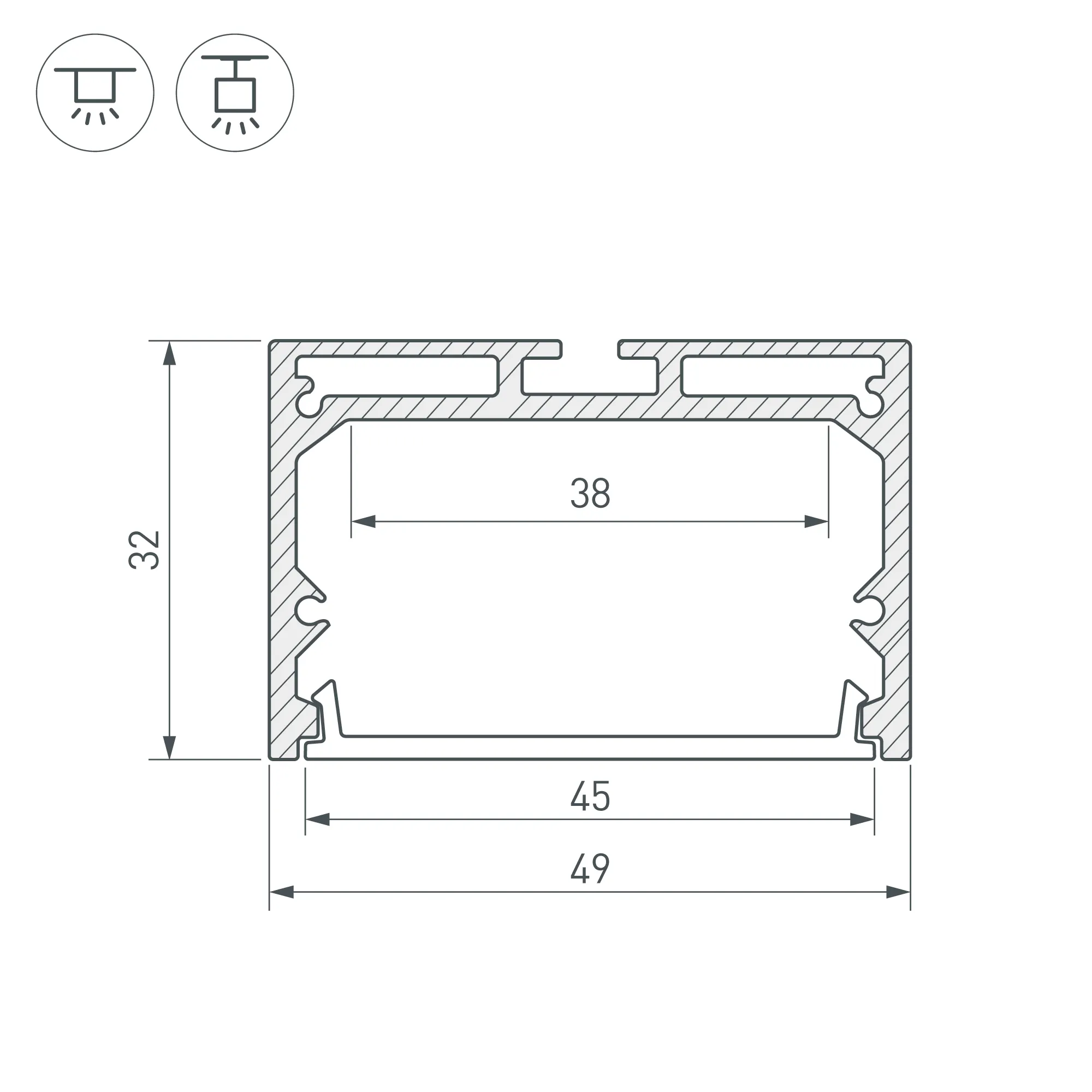 Комплект с экраном. Алюминиевый профиль для светодиодных лент и линеек. Цвет - белый RAL9003 (порошковая окраска). Габаритные размеры (L×W×H): 2500x49x32 мм. Ширина площадки для ленты 38 мм. Аксессуары приобретаются отдельно.