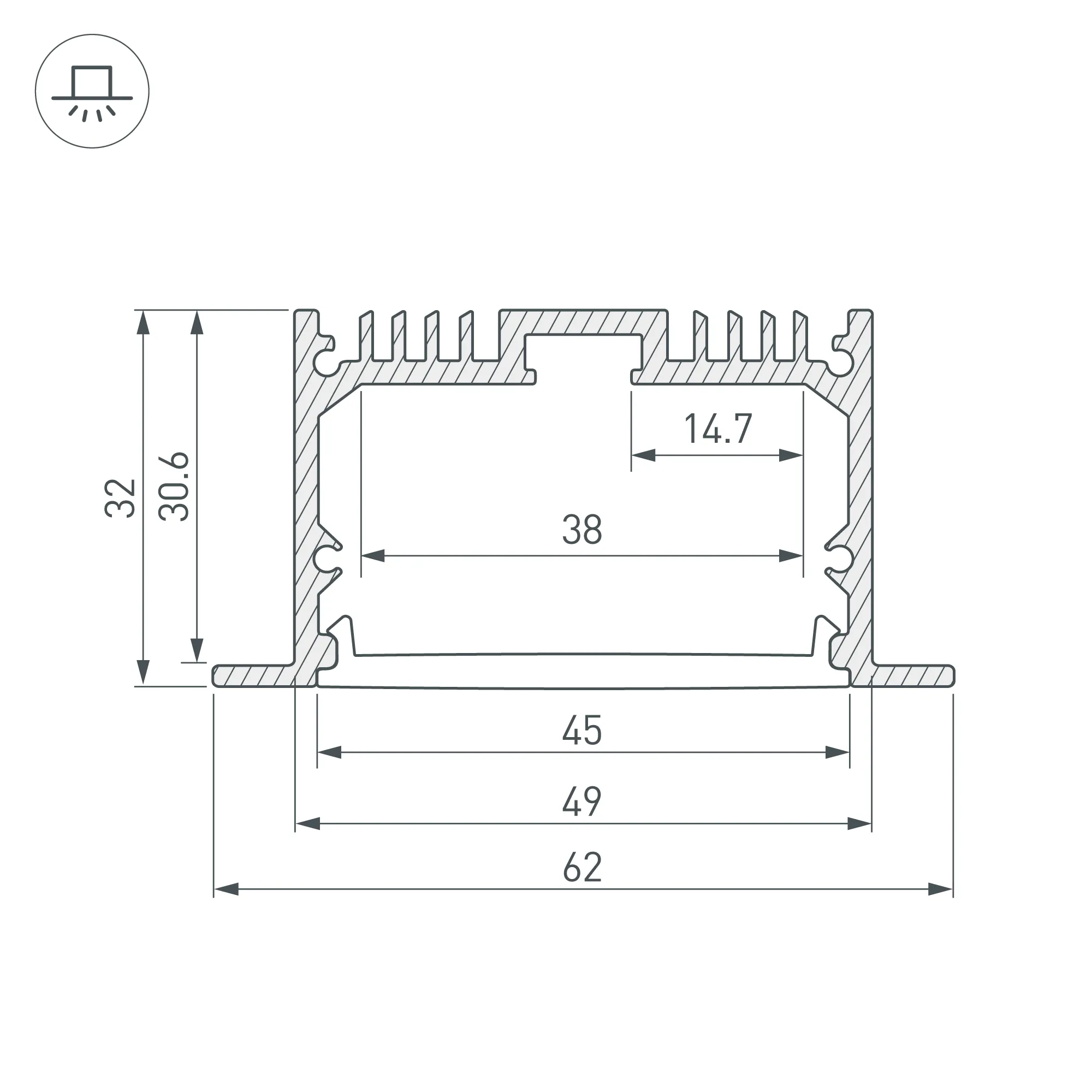 Комплект с экраном. Алюминиевый профиль для светодиодных лент и линеек. Цвет - черный RAL9005 (порошковая окраска). Габаритные размеры (L×W×H): 2500x62x32 мм, паз для установки 49 мм. Ширина площадки для ленты 38 мм. Аксессуары приобретаются отдельно.