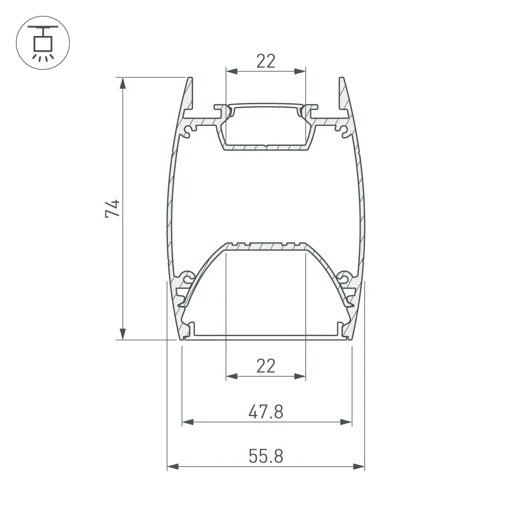 Алюминиевый анодированный подвесной профиль для светодиодных лент и линеек с двусторонним свечением для создания эффекта «отраженного света». Габаритные размеры (L×W×H): 2000x55,8x74мм. Состоит из двух частей - профиля и съемного основания (площадки) для ленты. Ширина площадок для лент 22 мм. Отсек для БП 50х26мм. Экраны, заглушки и другие аксессуары приобретаются отдельно. Цена за 1 метр.