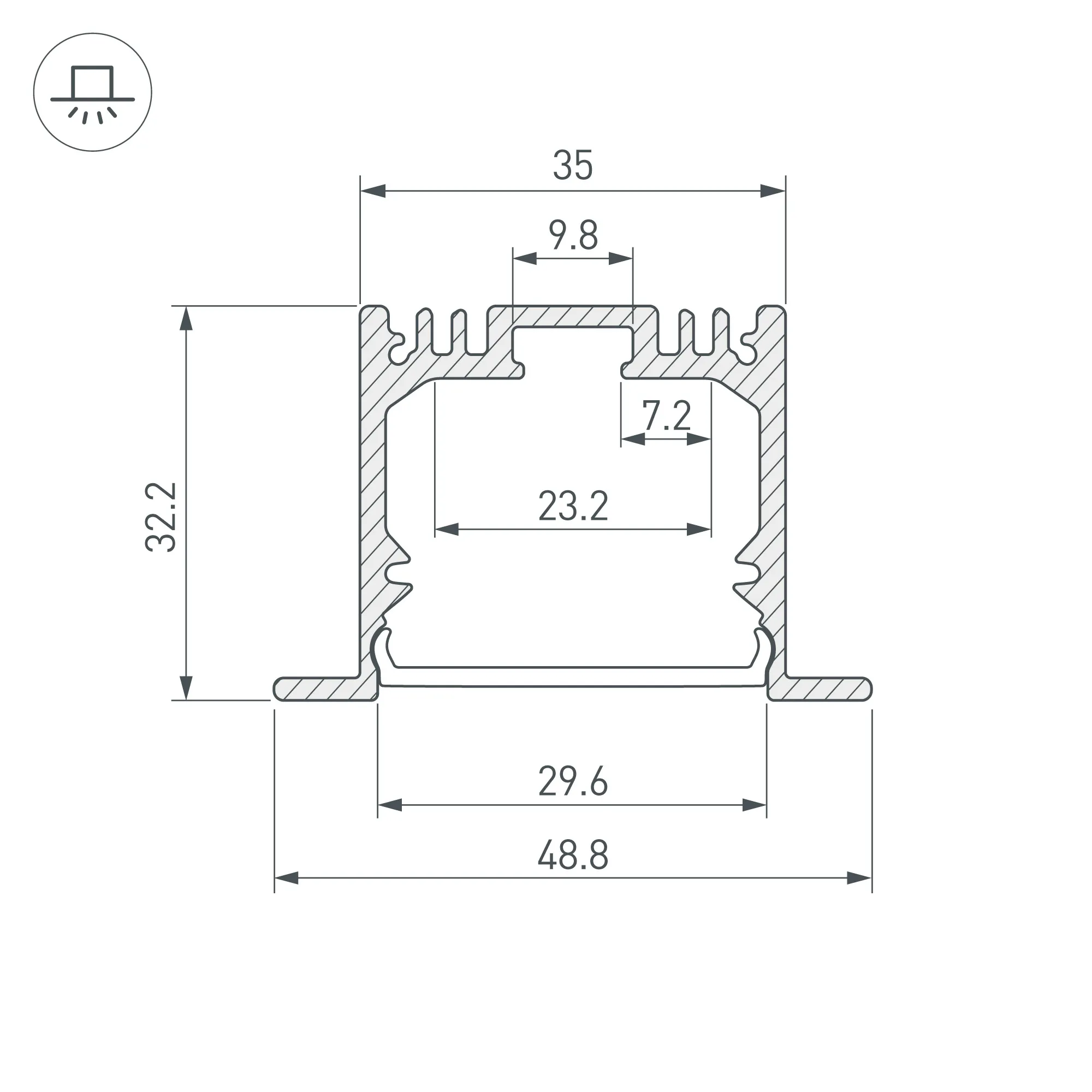 Алюминиевый профиль для светодиодных лент и линеек. Цвет - черный RAL9005 (порошковая окраска). Габаритные размеры (L×W×H): 2000x49x32 мм, паз для установки 35 мм. Ширина площадки для ленты 23 мм. Экраны, заглушки и другие аксессуары приобретаются отдельно. Цена за 1 метр.