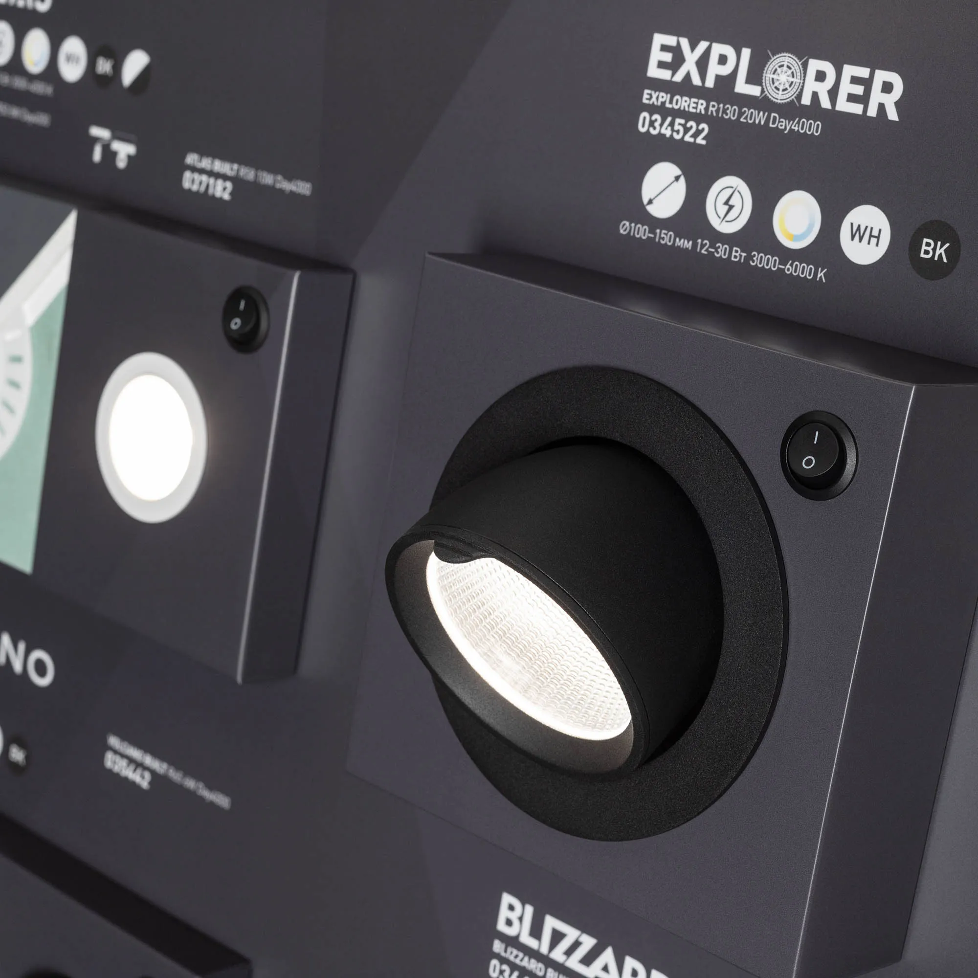 На стенде демонстрируются даунлайты разных размеров.