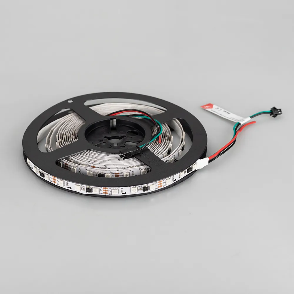 Светодиодная лента SPI серии B60 с микросхемой 16703. Светодиоды SMD 5060, 60 шт/м, 20 pixels на 1 м (100 pixels на 5 м), 1 pixel = 3 светодиода, белая плата шириной 10 мм, скотч 3М. Цвет RGB, угол 120°. Питание 12 В, мощность 14.4 Вт/м (72 Вт на 5 м). Размеры 5000x10x2.4 мм. Мин. отрезок 50 мм, 3 светодиода. Цена за 1м.