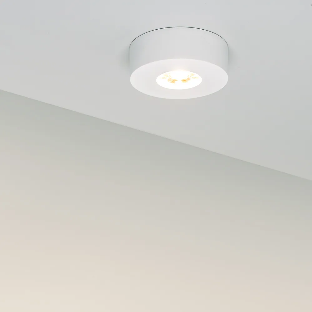 Накладной круглый мебельный светильник 5Вт, корпус белый алюминий. Цвет ТЕПЛЫЙ БЕЛЫЙ 3000K. Светодиод 1х5W. CRI>80, Св.поток 350-400лм, угол 10°. Питание 180-240VAC, 5Вт, 400mA 11-14V, драйвер встроенный. Размеры d70x25 мм.