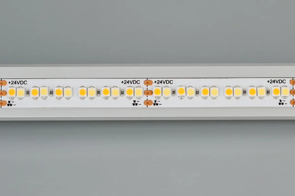 2-х канальная лента LUX с изменяемой цв.температурой, светодиоды smd 3528, 240шт/м (1200шт на 5м), белая плата 10мм, скотч 3М. Два цвета БЕЛЫЙ 6500K + ТЁПЛЫЙ 2700K. Угол 120°, цветопередача CRI>90. Питание 24V, мощность 19,2 Вт/м (96 Вт на 5м). Размеры 5000х10х1,8мм. Мин.отрезок 50мм, 12 светодиодов. Цена за 1м.