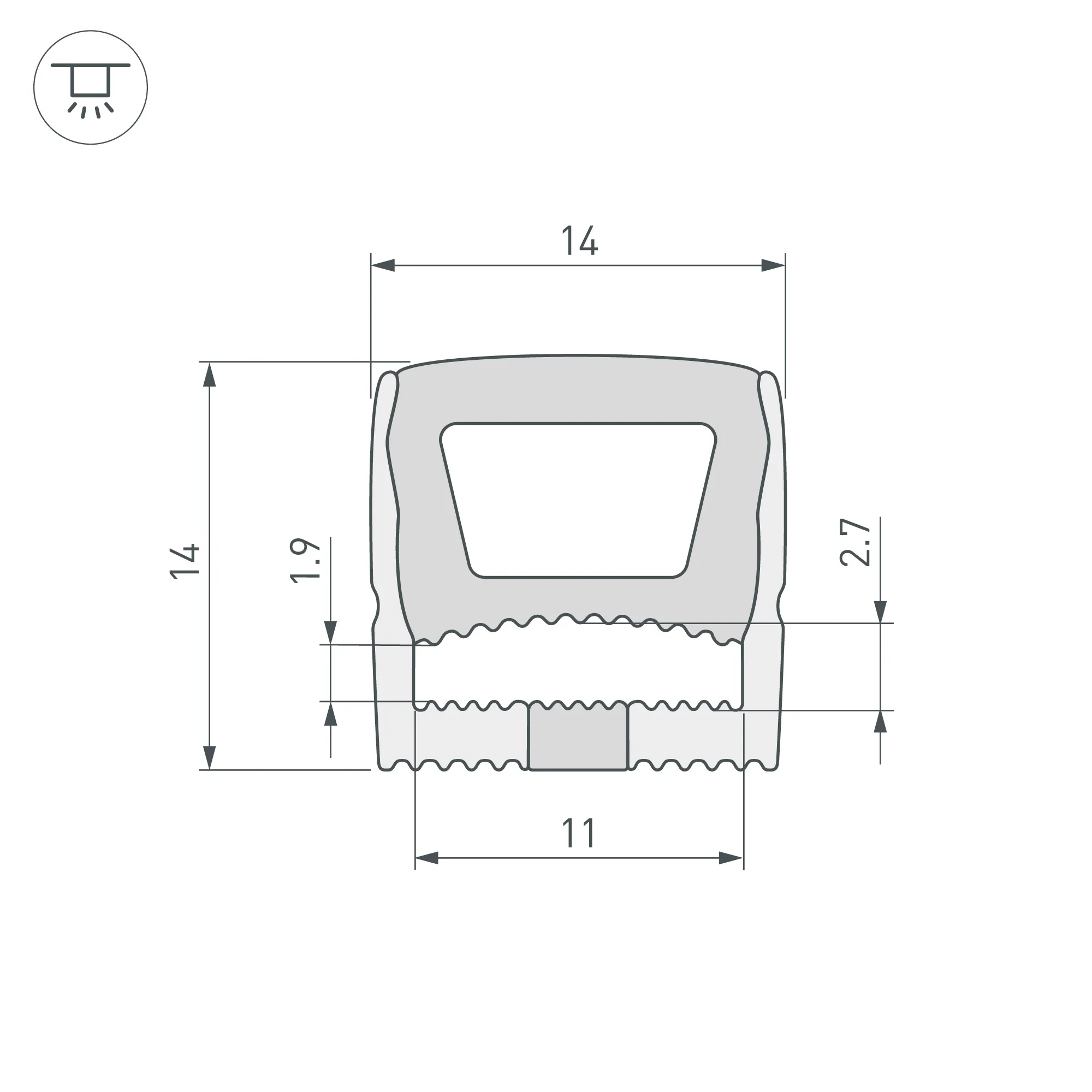 Цельнолитой силиконовый гибкий профиль, белый матовый. Габаритные размеры 5000×14×14 мм. Вертикальный изгиб TOP, минимальный радиус изгиба 60 мм. Для установки во влажных помещениях необходима герметизация при помощи двухкомпонентного эпоксидного герметика. Класс пылевлагозащиты – IP65 (при соблюдении технологии герметизации). Для лент шириной от 10 до11 мм, высотой до 2,5 мм и мощностью до 10 Вт/м. При подборе ленты необходимо учитывать, что втяжка лент COB, герметичных лент и лент с наличием силиконового слоя может быть затруднена. Угол излучения 115°. Поставляется в катушках по 5 м. Цена за 1 м.