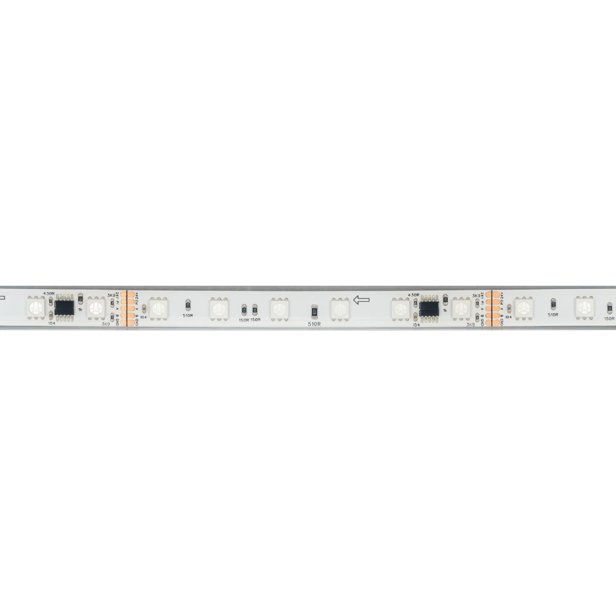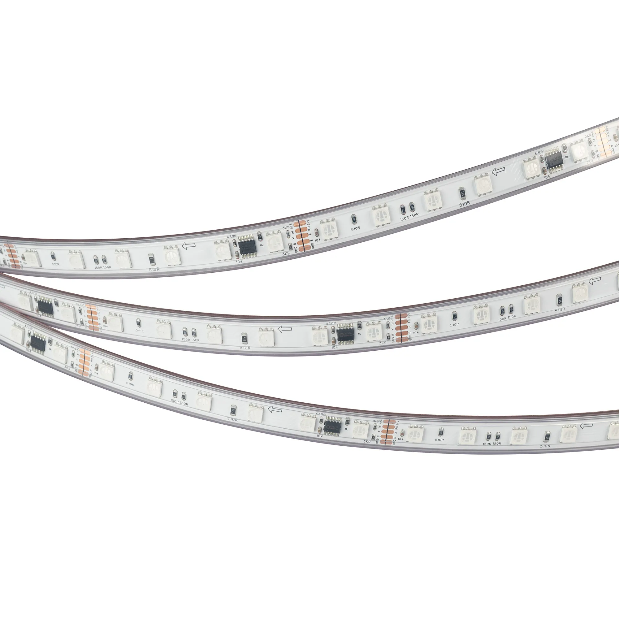 Светодиодная герметичная лента DMX серии B60 с микросхемой GS8526, IP68 (PFS - полная силиконовая экструзия). Светодиоды SMD 5060, 60 шт/м, 10 pixels на 1 м (50 pixels на 5 м), 1 pixel = 6 светодиодов, белая плата шириной 10 мм, скотч 3М. Цвет RGB, угол 120°. Питание 24 В, мощность 14 Вт/м (70 Вт на 5 м). Размеры 5000x12x5 мм. Мин. отрезок 100 мм, 6 светодиодов. Цена за 1 м.