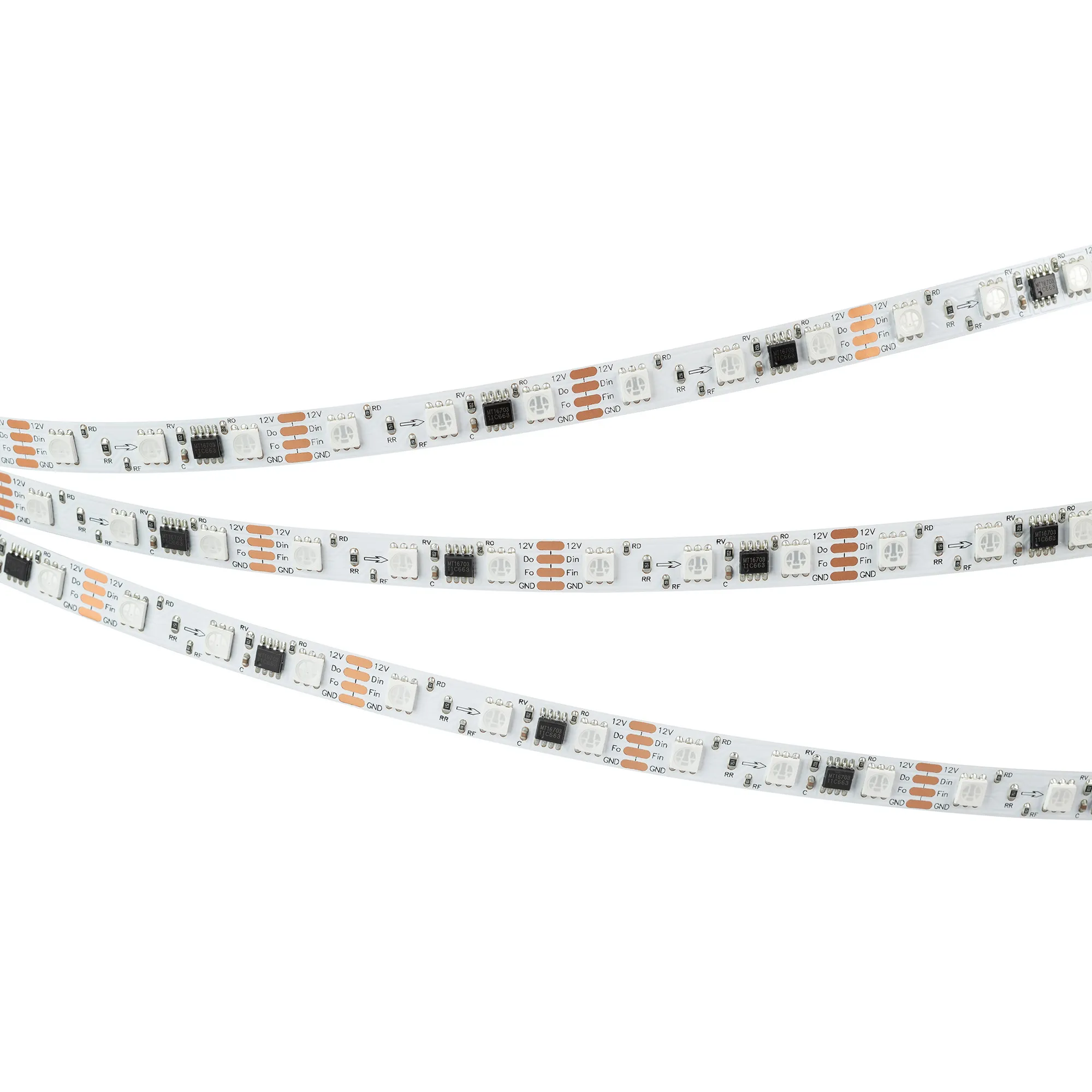Светодиодная лента SPI серии B60 с микросхемой MT1808A. Светодиоды SMD 5060, 60 шт/м, 20 pixels на 1 м (100 pixels на 5 м), 1 pixel = 3 светодиода, белая плата шириной платы 10 мм, скотч 3М. Цвет RGB, угол 120°. Питание 12 В, мощность 12 Вт/м (60 Вт на 5 м). Размеры 5000x10x2 мм. Мин. отрезок 50 мм, 3 светодиода. Цена за 1 м.