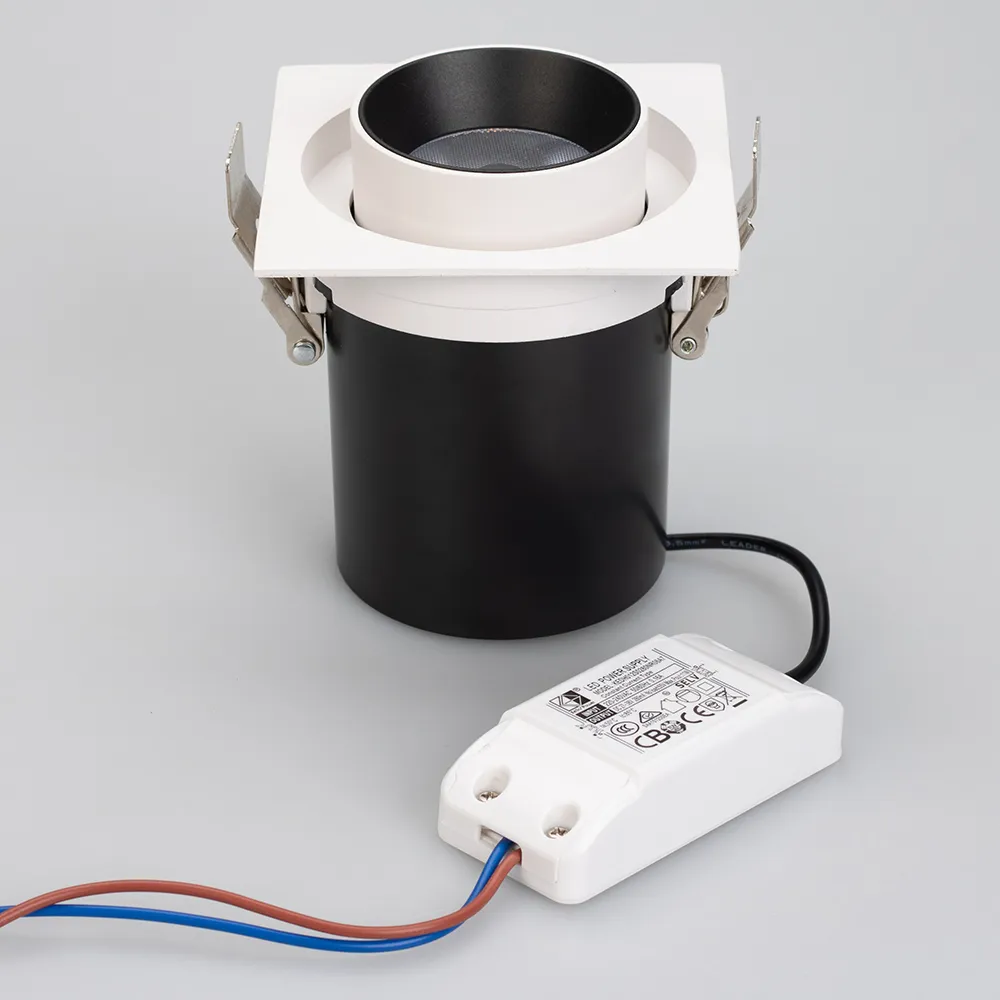 Встраиваемый поворотный выдвигающийся светильник для потолка. Светодиоды 10W, цвет БЕЛЫЙ 6000K, св.поток 900лм, угол 20°, RA>90. Корпус белый. Мощность 10Вт, питание AC220-240V. Размеры WxLxH 100x100x110мм. Установка в отверстие 90мм. Драйвер в комплекте (27-38V 260mA).