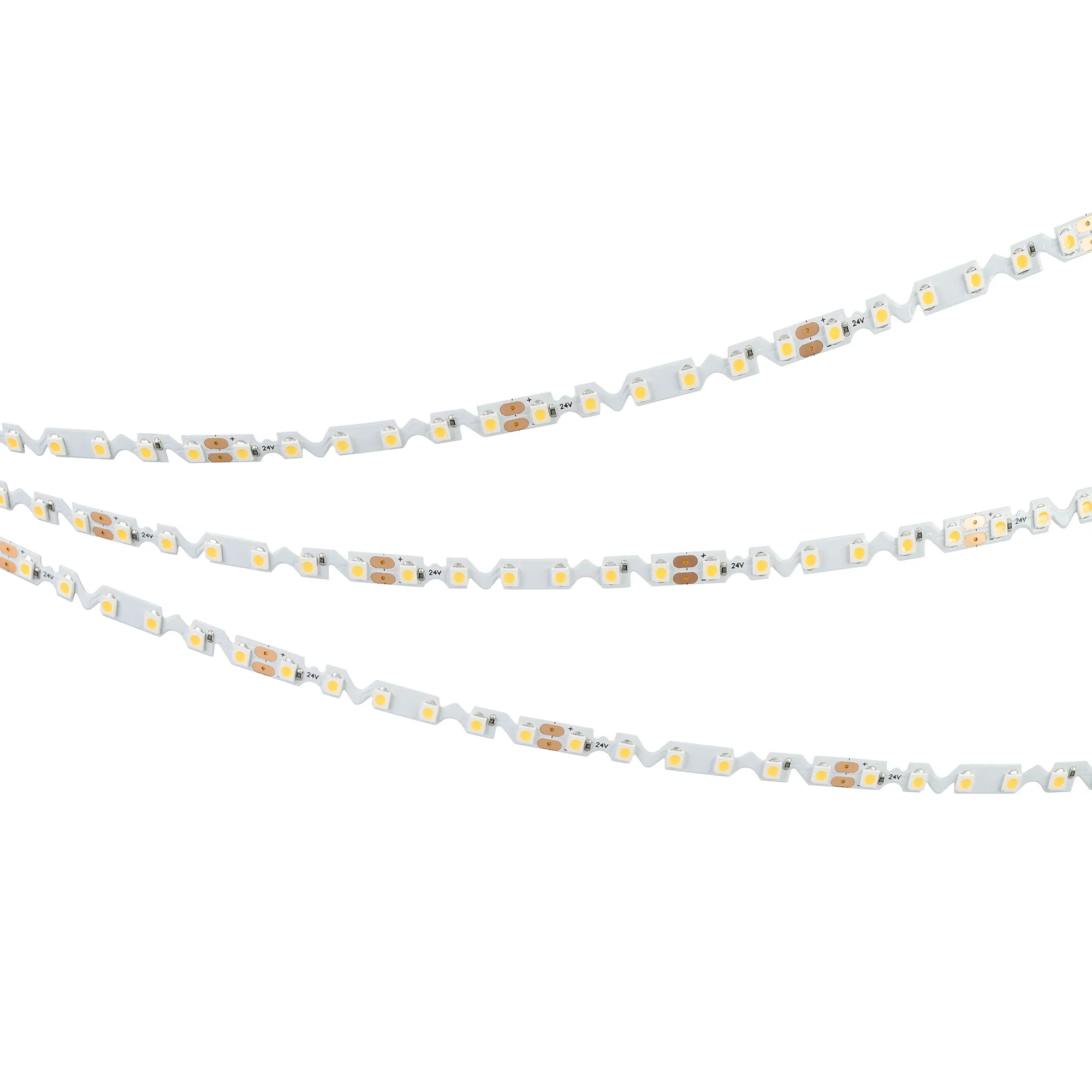 Гибкая светодиодная лента RZ серии A120 с фигурной платой в форме волны, легко изгибается на плоскости. Светодиоды SMD 2835, 120 шт/м, белая плата шириной 6 мм, скотч 3М. Цвет ТЕПЛЫЙ 3000K, индекс цветопередачи CRI>90, угол 120°. Питание 24 В, мощность 9.6 Вт/м (48 Вт на 5 м). Размеры 5000х6х1.3 мм. Мин. отрезок 50 мм, 6 светодиодов. Цена за 1 м. Обязательна установка на профиль.