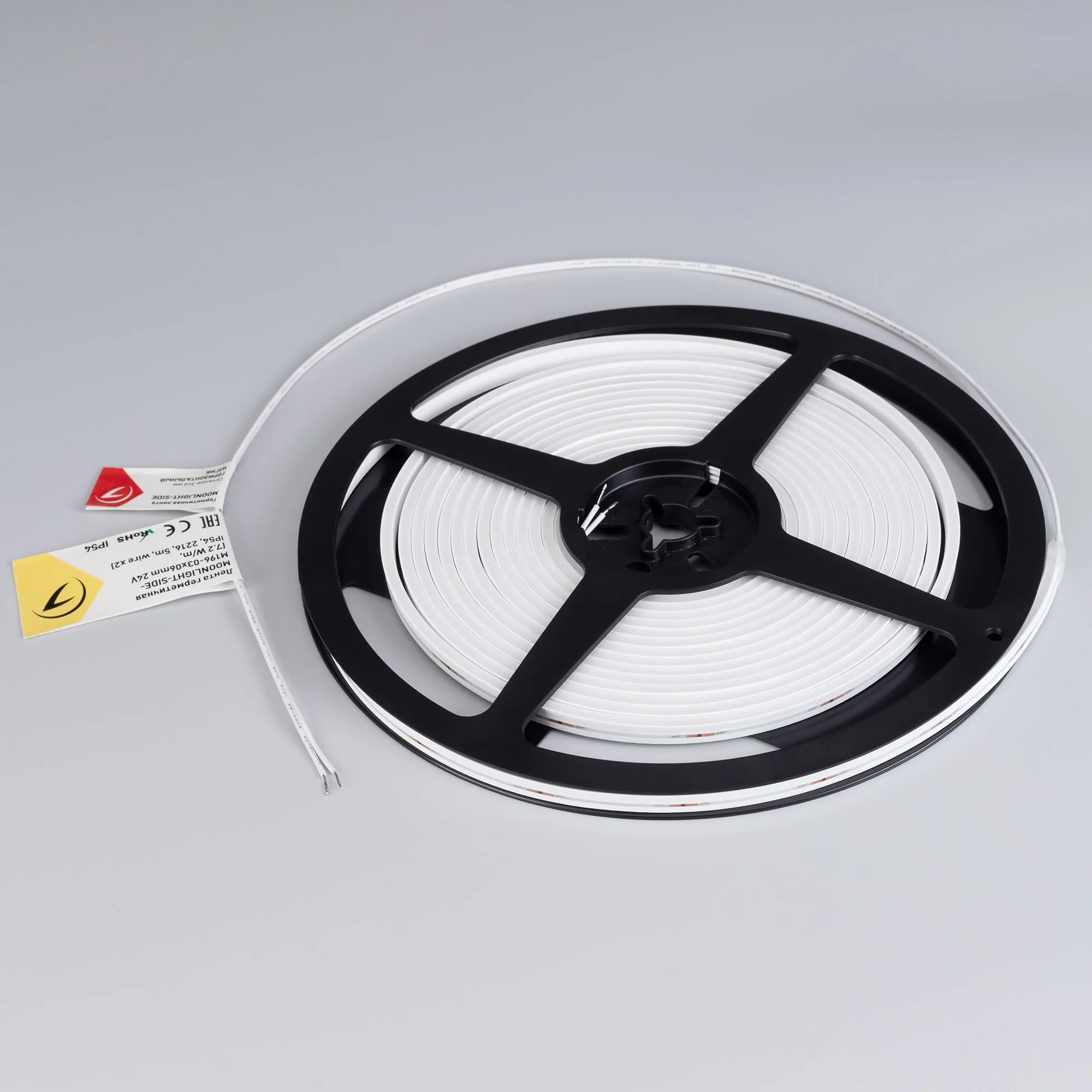 Гибкая герметичная лента (неон серии MOONLIGHT), сечение 3×6 мм. Светодиоды SMD 2216 196 шт/м. Цвет свечения ТЁПЛЫЙ (3000 К), индекс цветопередачи CRI>90, световой поток 185 лм/м, угол излучения 112°. Мощность 7.2 Вт/м, питание 24 В. Класс пылевлагозащиты IP54. Размеры 5000×3×6 мм. Мин. отрезок 35.7 мм. Горизонтальный изгиб SIDE, минимальный радиус изгиба 30 мм. Кабель питания длиной 500 мм, вывод с двух сторон вдоль линии сечения неона. Катушка 5 м. Цена за 1 м. Гарантия 3 года.