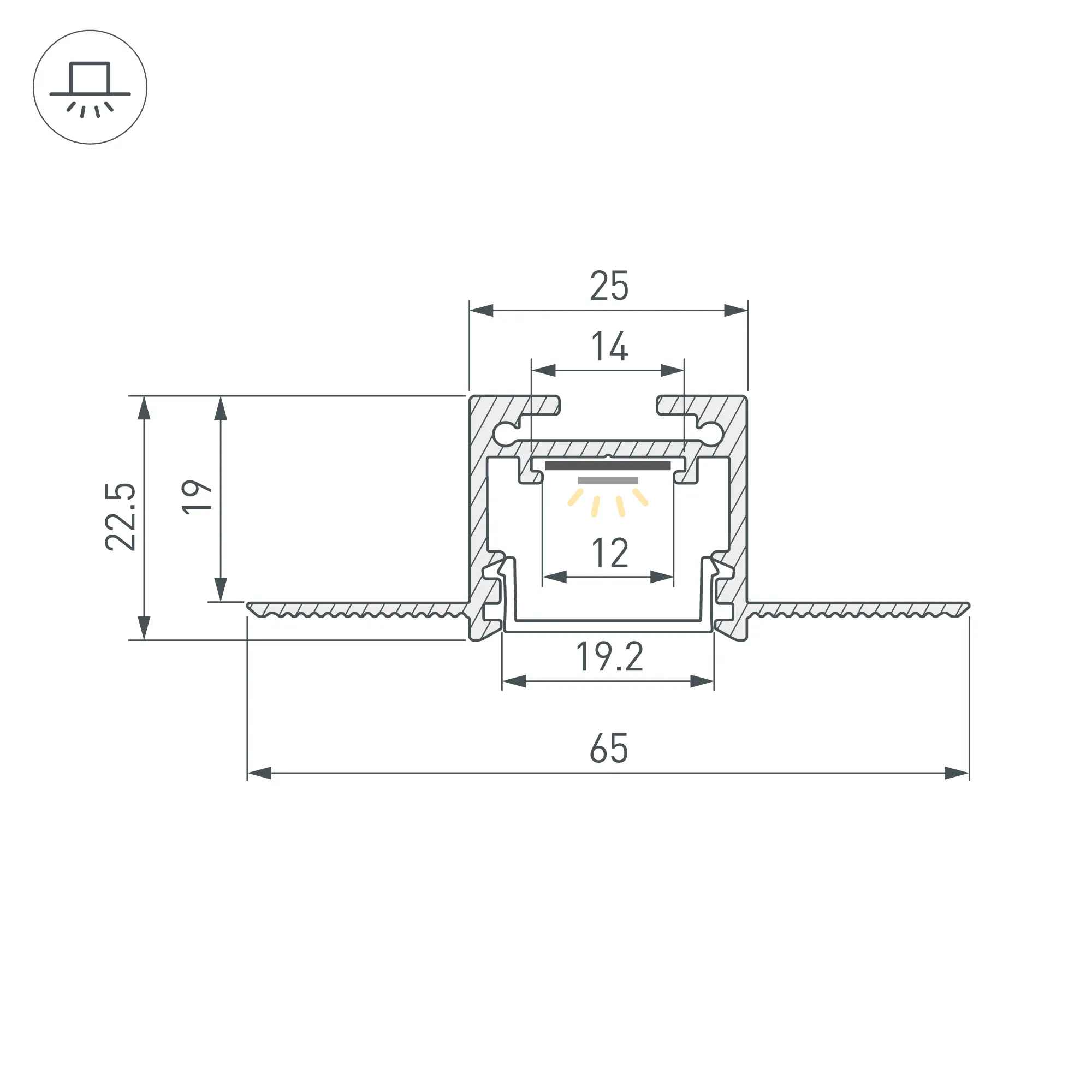 Алюминиевый профиль для светодиодных лент и линеек. Скрытая установка (под строительную отделку). Цвет - белый RAL9003 (порошковая окраска). Габаритные размеры (L×W×H): 2500x65x22 мм. Ширина площадки для ленты 12 мм. Экраны, заглушки и другие аксессуары приобретаются отдельно. Цена за 1 метр.