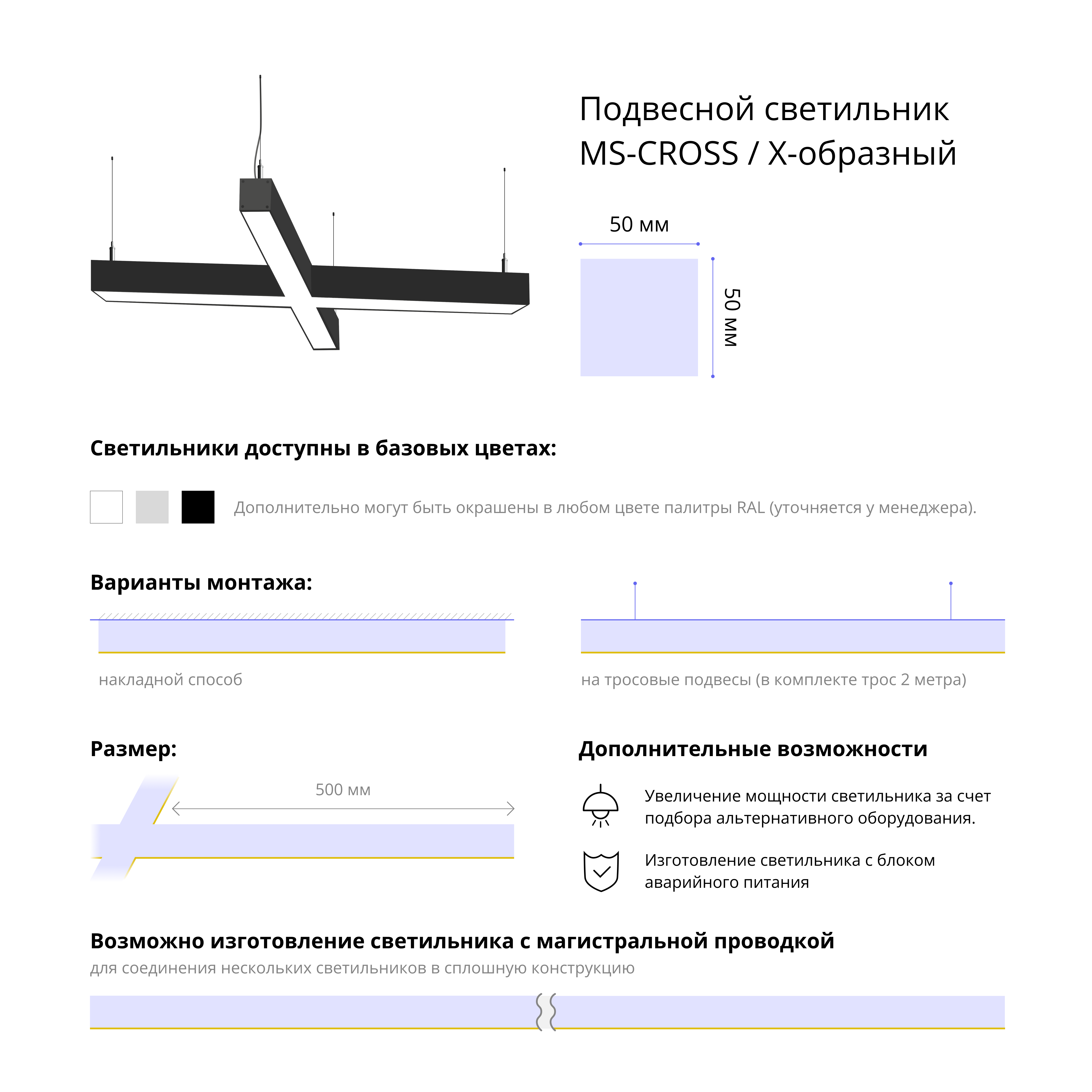 - Варианты монтажа: на тросовые подвесы (в комплекте трос 2 метра) и накладным способом.