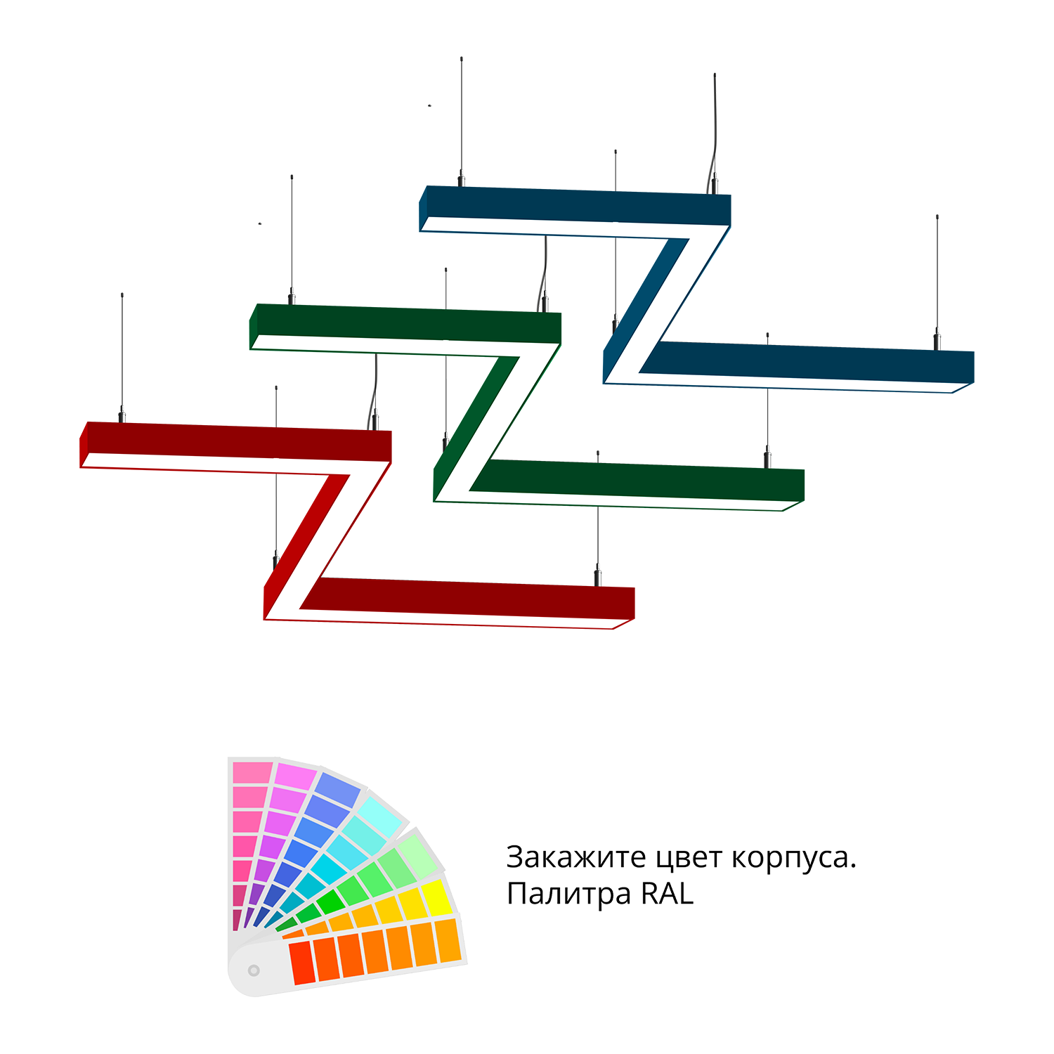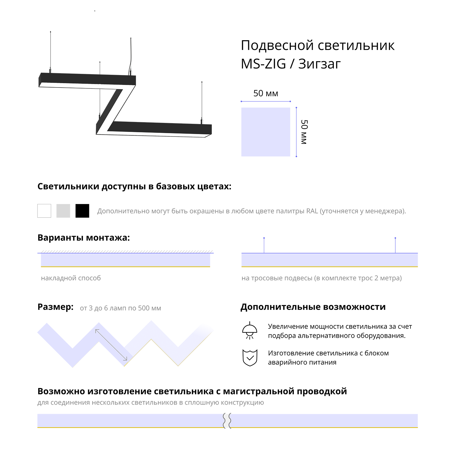 Cветодиодный фигурный светильник MS-ZIG Зигзаг размер профиля 50x50мм длиной 6х500мм мощностью 120W. Светильник собирается из алюминиевого основния с матовым рассеивателем, который дает равномерную засветку по всей площади.