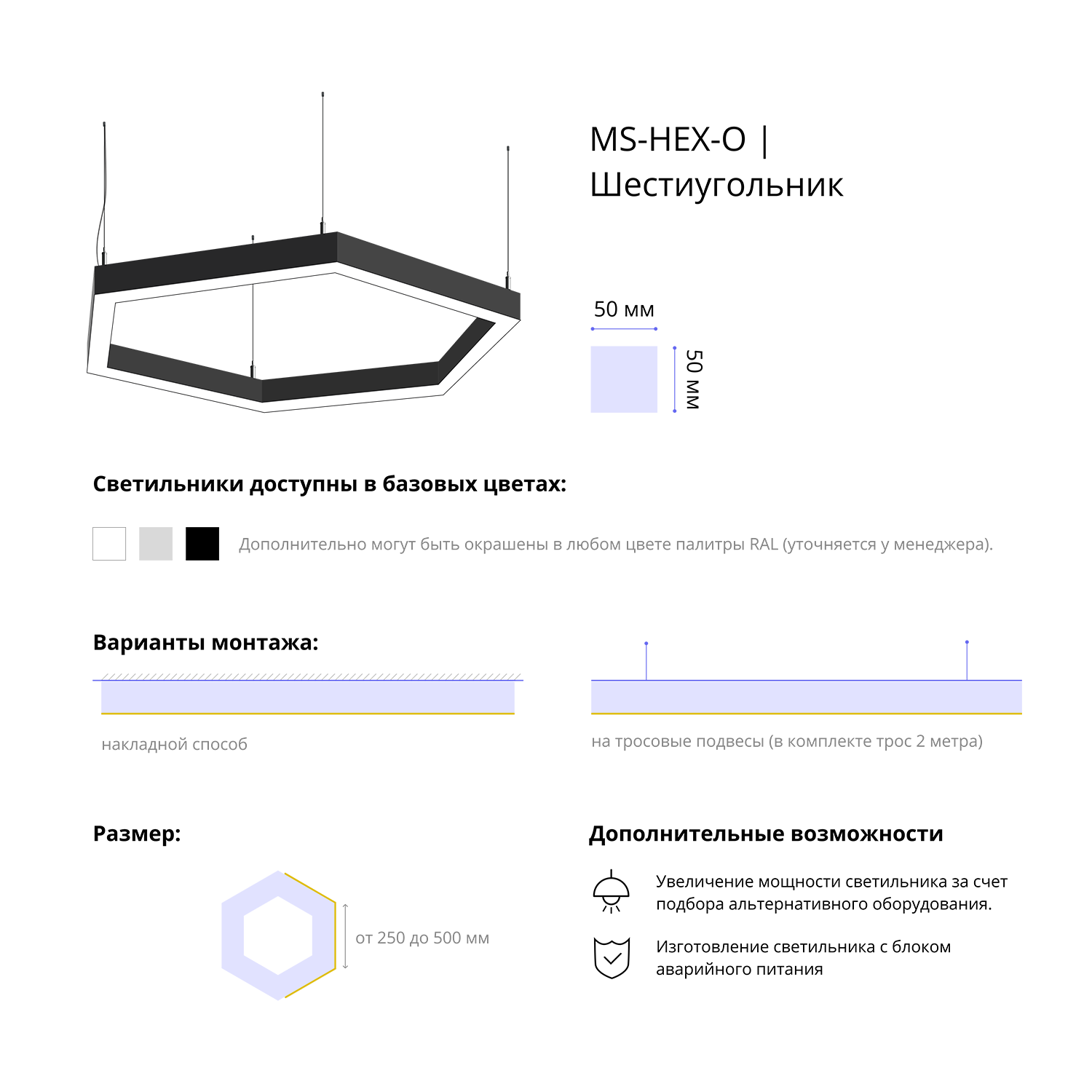 - Варианты монтажа: на тросовые подвесы (в комплекте трос 2 метра) и накладным способом.