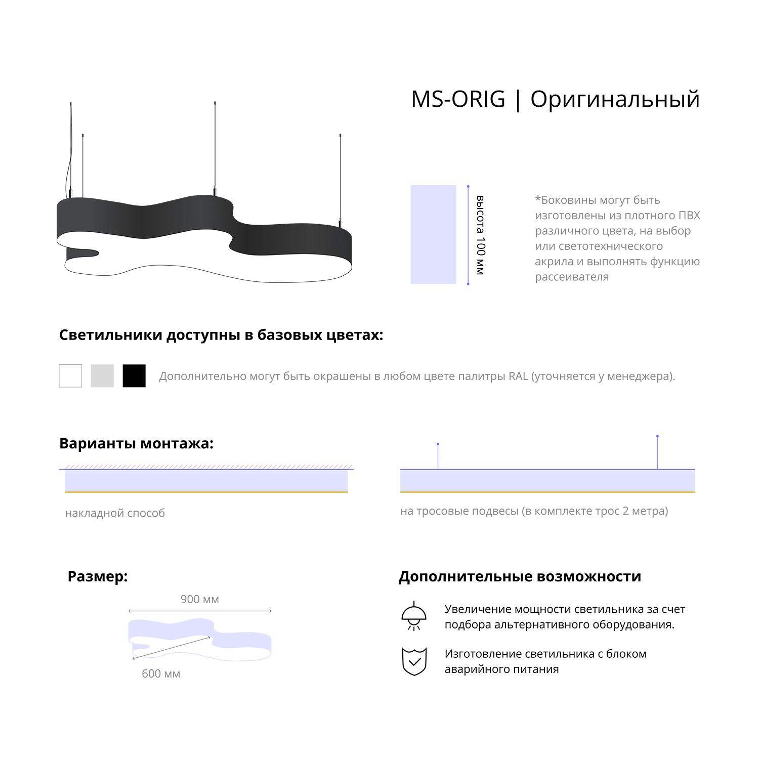- Варианты монтажа: на тросовые подвесы (в комплекте трос 2 метра) и накладным способом.