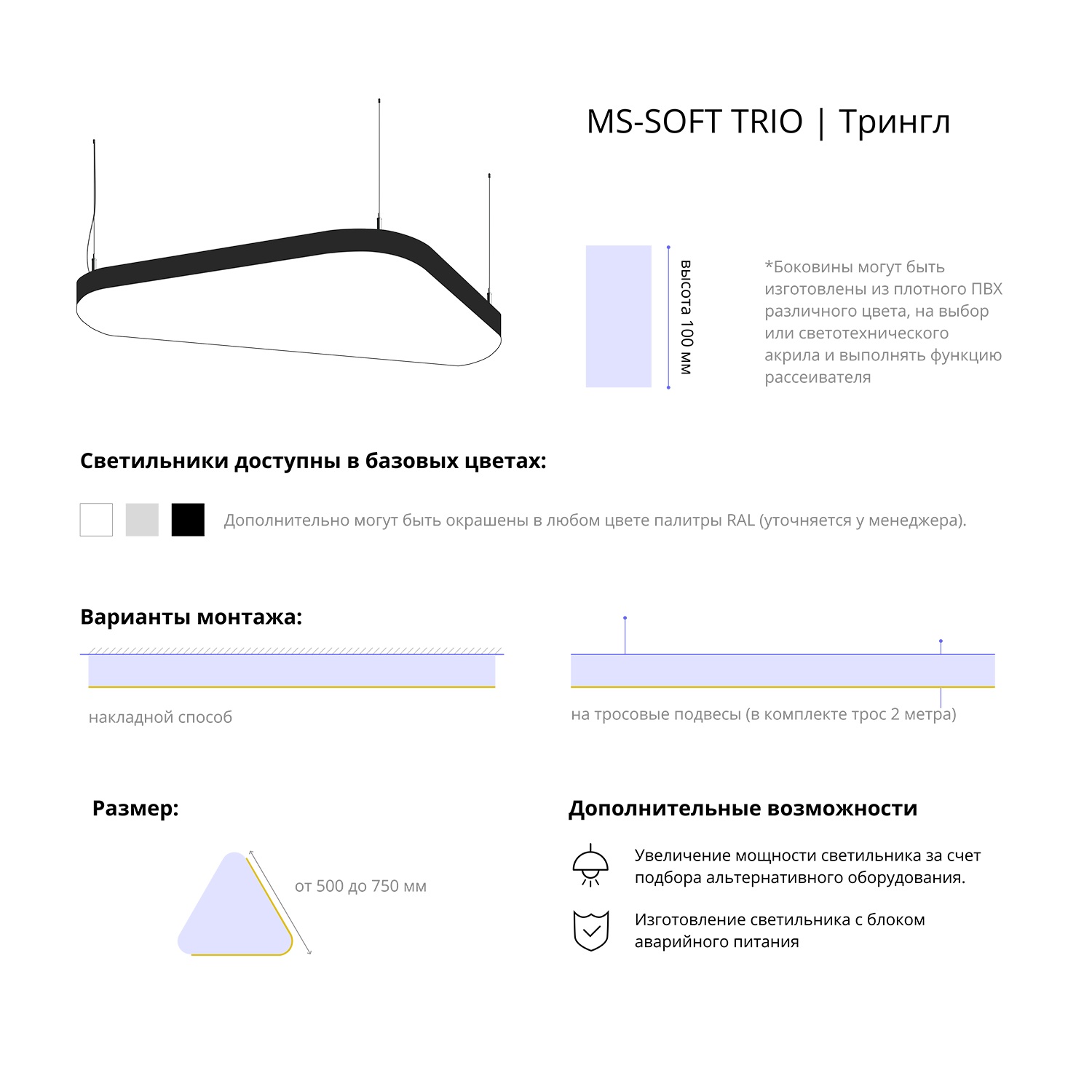 - Варианты монтажа: на тросовые подвесы (в комплекте трос 2 метра) и накладным способом.
